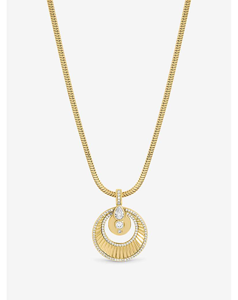Inicio Two Tone and Crystal Disk Pendant - Gift Pouch Our Inicio Two Tone and Crystal Disk Pendant is a must have, Featuring a beautifully layered gold-and-silver disc design, the pendant blends warm and cool tones for a modern mixed-metal look that pairs perfectly with any outfit. Fastening: Lobster clasp Material: Two tone plated base metal Chain length: 18, extender length: 2". Width: 32mm, length: 32mm. Comes in gift pouch "
