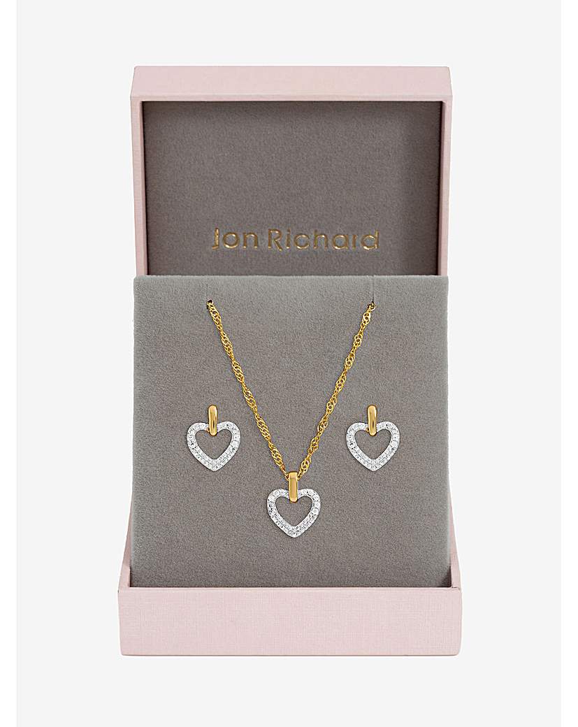 Jon Richard Two Tone Open Heart Set - Gift Box The Jon Richard Two Tone Open Heart Set celebrates love in all its shades. Crafted in silver and gold, it's a modern expression of harmony, unity, and everlasting affection. Beautifully presented in a reusable gift box. Fastening: Lobster clasp, post and bullet back Material: Two tone plated base metal Chain length: 16, extender length: 2". Width: 15mm, length: 15mm. Non-returnable: in the interest of hygiene we are unable to exchange or refund this item unless faulty, this does not affect your statutory rights. Comes in gift box "