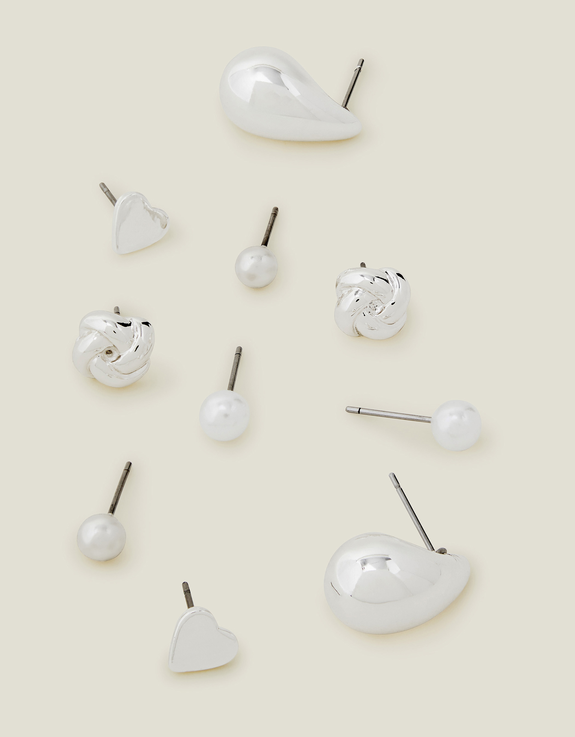 Cast in silver-tone metal, this five pack of earrings presents knots, faux pearls, hearts, and drops.Non-refundable.