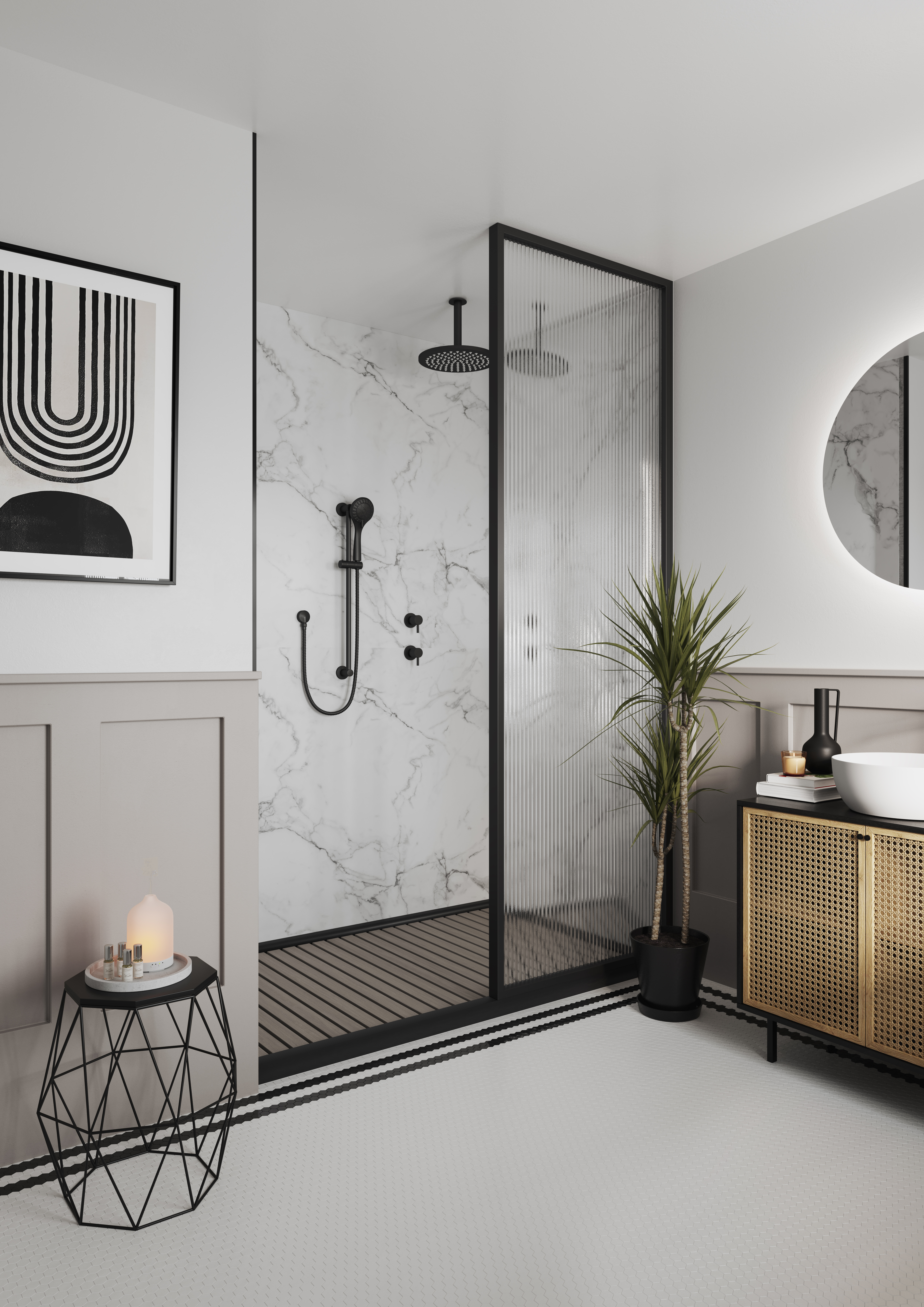Multipanel Pure Hydrolock Tongue & Groove White Grey Shower Panel - 2700 x 598 x 11mm - This pure collection by Multipanel offers a cost effective and functional solution for transforming your bathroom with clean, sheer finishings of pure colour and classic textures. Multipanel is quick, easy to fit and fully waterproof with an exterior grade MDF core and hydrolock tongue and groove edges.