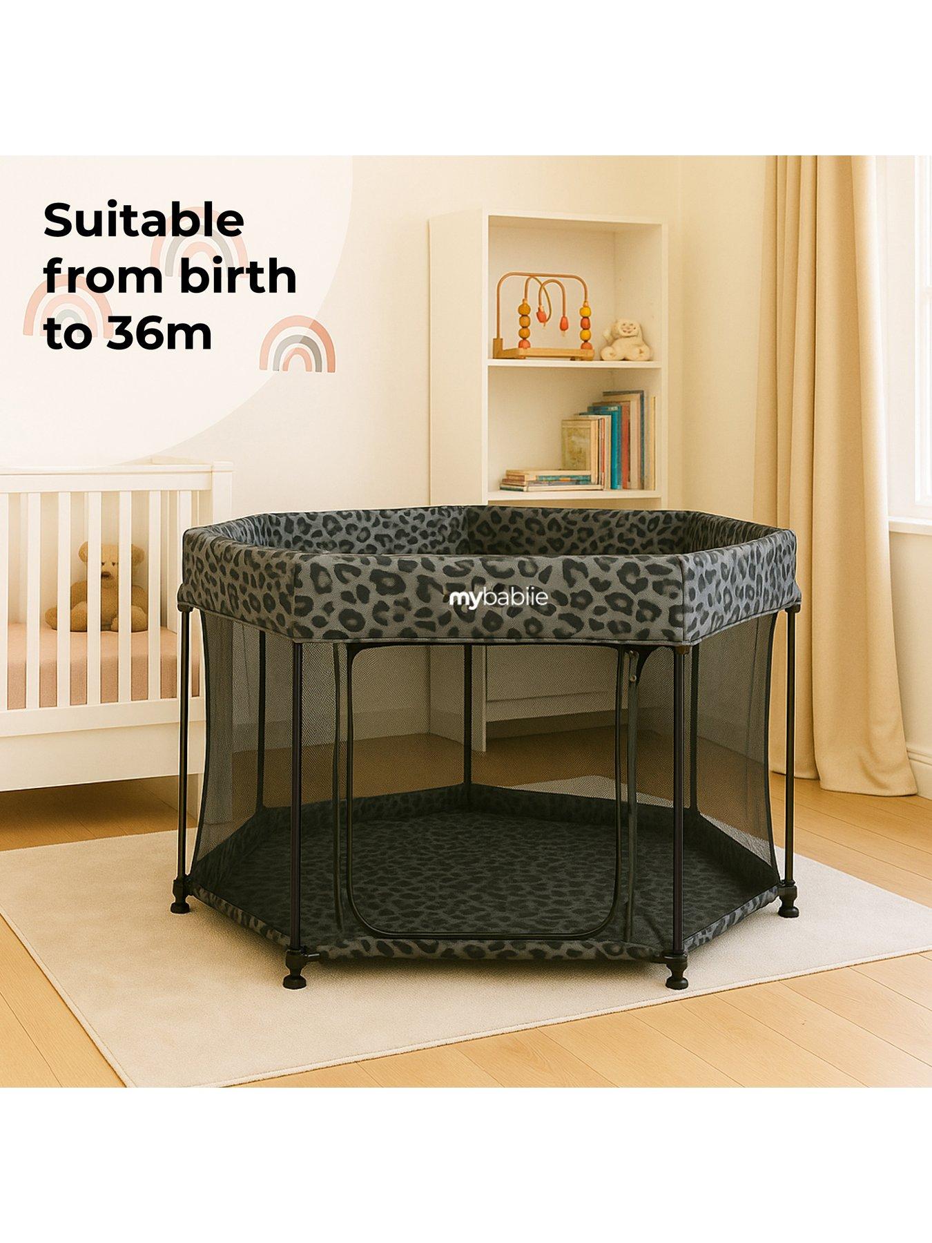 My Babiie Foldable Baby Playpen - Grey Leopard Accessory List: Carry/storage bag Depth: 127 CM Height: 75 CM Material Content: Polyester, Steel, Plastic Width: 127 CM Age Range: Birth to 6 months Assembly: Ready Assembled Spacious design with plenty of room for play and rest Breathable mesh sides for visibility and airflow Sleek, modern design, suits any home decor Strong and sturdy construction for safe playtime Soft, comfortable base for your baby's comfort Easy to assemble and fold away for storage or travel Suitable from birth up to approx. 15 kg (or until baby can climb out) Wipe-clean materials for quick and easy maintenance Lightweight and portable for use around the home Handy carry bag included