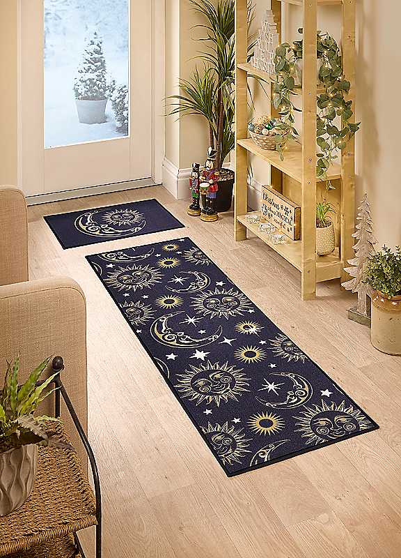 Our new Moon & Sun design features a gold crescent moon and a sun on a dark blue background. Hardwearing and washable, perfect for busy homes. Line dry 2 piece set Hard wearing and fast drying Machine washable at 30 degrees. Material: Polyester face & Rubber backing Mat size: 40x60cm Runner size: 50x150cm