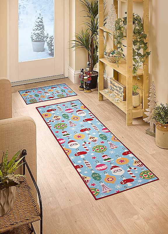 For a fun and festive welcome, shop our Multi Bright Christmas mat and runner set! Featuring bright baubles on a light blue background and a red border, the perfect Christmassy welcome for your doorway! Line dry 2 piece set Hard wearing and fast drying Machine washable at 30 degrees. Material: Polyester face & Rubber backing Mat size: 40x60cm Runner size: 50x150cm | door mat runner, christmas door mat