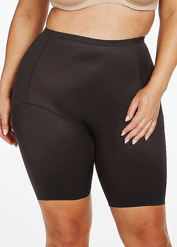 How many times have your bought a shaper, loved its fit, but then let it languish in your dresser drawer because it no longer fit after you gained or lost some weight? Well, this style will avoid that fate. Incorporating an adjustable fabric, it also features an incredibly flexible Wonderful Panel® that provides targeted, stitch-free, no-show tummy control. Bonded to the primary ply only at its perimeter, this panel adjusts to changes in your body's size in a way that traditional, rigid panels cannot. And, a mesh insert at the top of the garment's back prevents the waistband from digging, pinching, or rolling while providing additional adjustability. Choose this bike pant to shape your tummy, hips, & upper thighs. Brand: Naomi & Nicole Plus size Comfort Control Brief Machine washable (warm) Use only non-chlorine bleach when needed Tumble dry low Do not iron Do not dry clean Body: 82% Nylon, 18% Elastane (Spandex) Gusset: 92% Cotton, 8% Elastane (Spandex) | waist shapewear, tummy compression garment, plus size shapewear, thigh shaper, black shape wear, high waisted shapewear, tummy thigh shaper