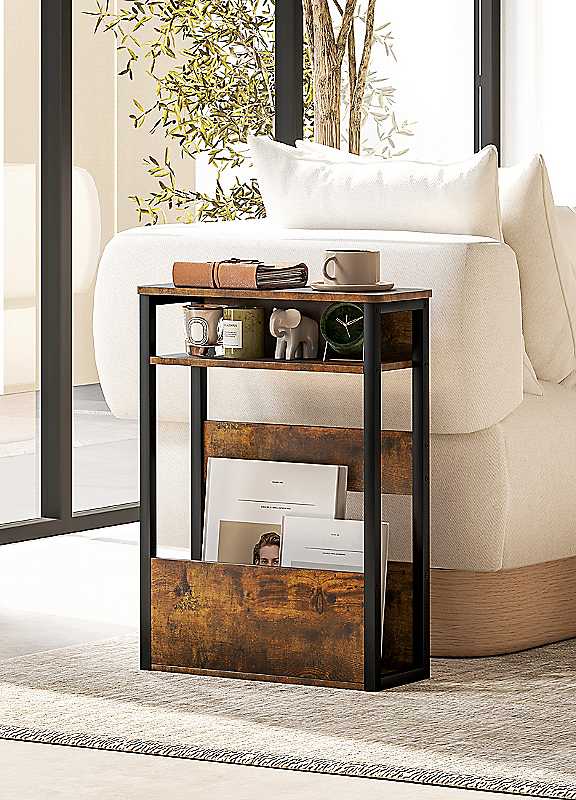 Add bold character and practical storage to any corner of your home with this space-saving industrial-style side table. Featuring a compact, narrow frame, two open shelves, and a durable tabletop, it's perfect for small bedrooms, hallways, or living rooms where you want style without taking up space. Includes a large bottom shelf, small middle shelf, and flat top - ideal for books, decor, lamps, or everyday essentials. At just 18cm deep, this narrow table fits where others cant - perfect for tight gaps, entryways, or beside sofas and beds. A black metal frame paired with rustic brown wood-effect panels creates a bold, eye-catching contrast. Powder-coated steel provides a strong, stable base. Adjustable feet help keep the table balanced on uneven floors. Works great as a nightstand, side table, end table, or hallway organizer.Total Weight capacity: 40 kgTop Weight capacity: 10 kgEach shelf capacity: 5 kgAssembly Required: Easy-to-follow instructions includedParticle Board, Powder-Coated MetalOverall dimensions approx. 58.5H x 46W x 18D cm Middle shelf size approx. 10H x 39.5W x 18D cmBottom shelf dimensions approx. 16H x 39.5W x 13.5D cmPlease remember to measure your available space before ordering. If using on an un-carpeted floor we recommend rubber or felt protection pads be used under the legs to avoid damage to your floors. | small side table, bedside table shelf, narrow sideboard table, bedside table small, side table bedroom, freestanding room shelves, narrow bedside table