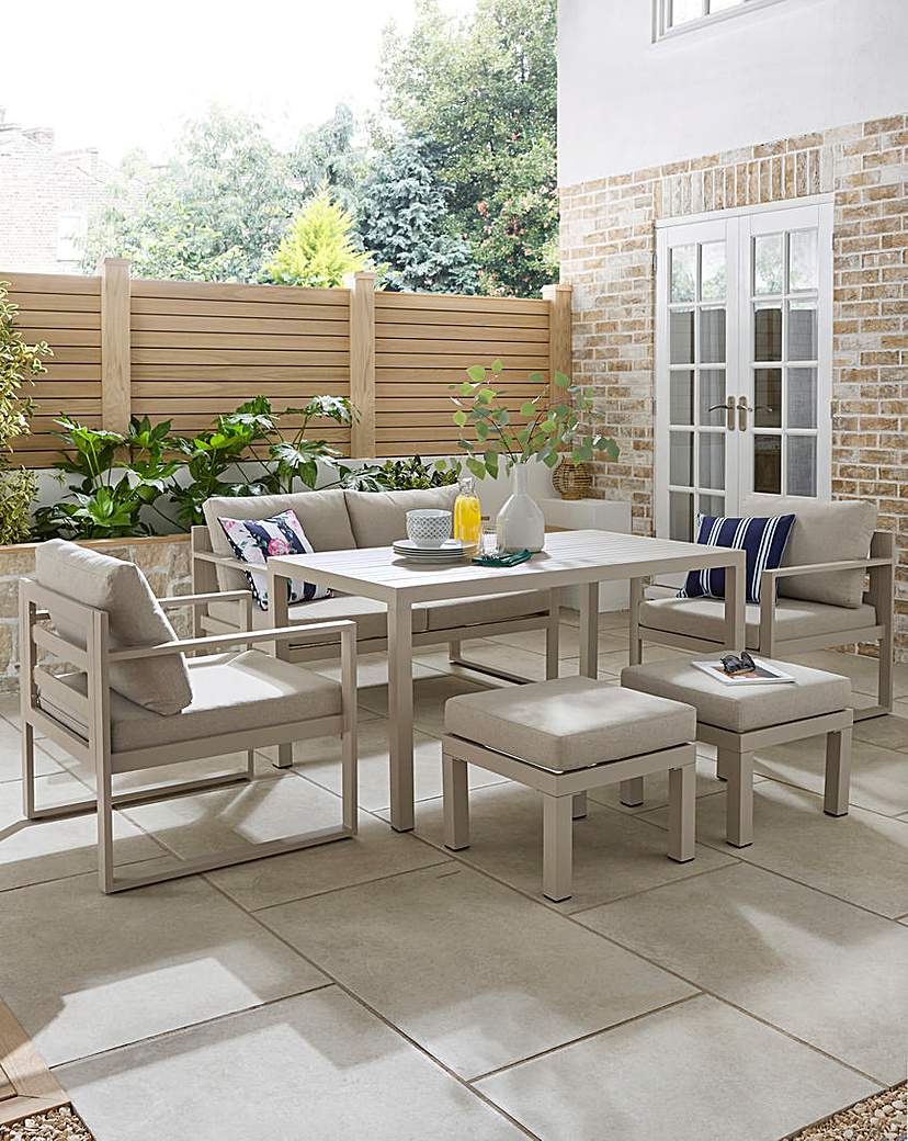 The Soho Aluminium Dining Set includes a double sofa, two single sofas, two footstools and an aluminium square table. The ergonomically designed sofa allows the whole body and mind to relax. The all-aluminium frame is sturdy and durable, making it the perfect choice for the garden. 2 Years manufacturer warranty.