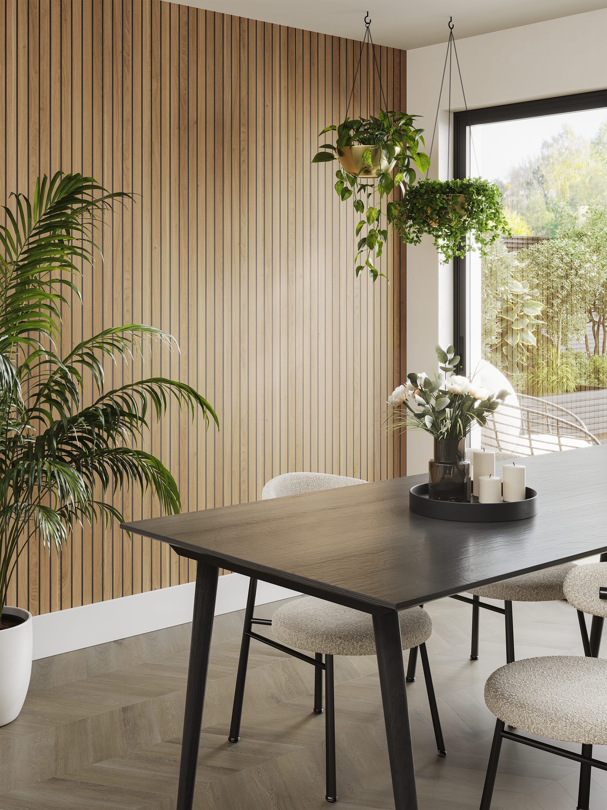 Naturepanel Hydrolock Tongue & Groove Woodslat Brown Cuneo Oak Laminate Wall Panelling - 2700 x 598 x 11mm - Naturepanel aims to provide a contemporary alternative to traditional slat wall - one that not only boasts an appealing aesthetic but also ensures effortless installation and convenient maintenance. With an emphasis on natural materials, this range will allow you to embrace simplicity and minimalism with designs that are clean and visually balanced.