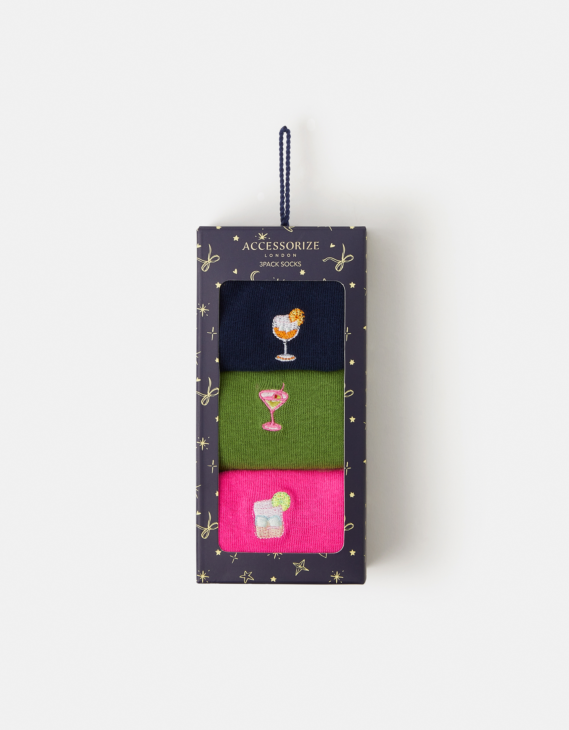 Navy, Green & Pink Embroidered Cotton 3 Pack Cocktail Socks Gift Box, Women's - Accessorize