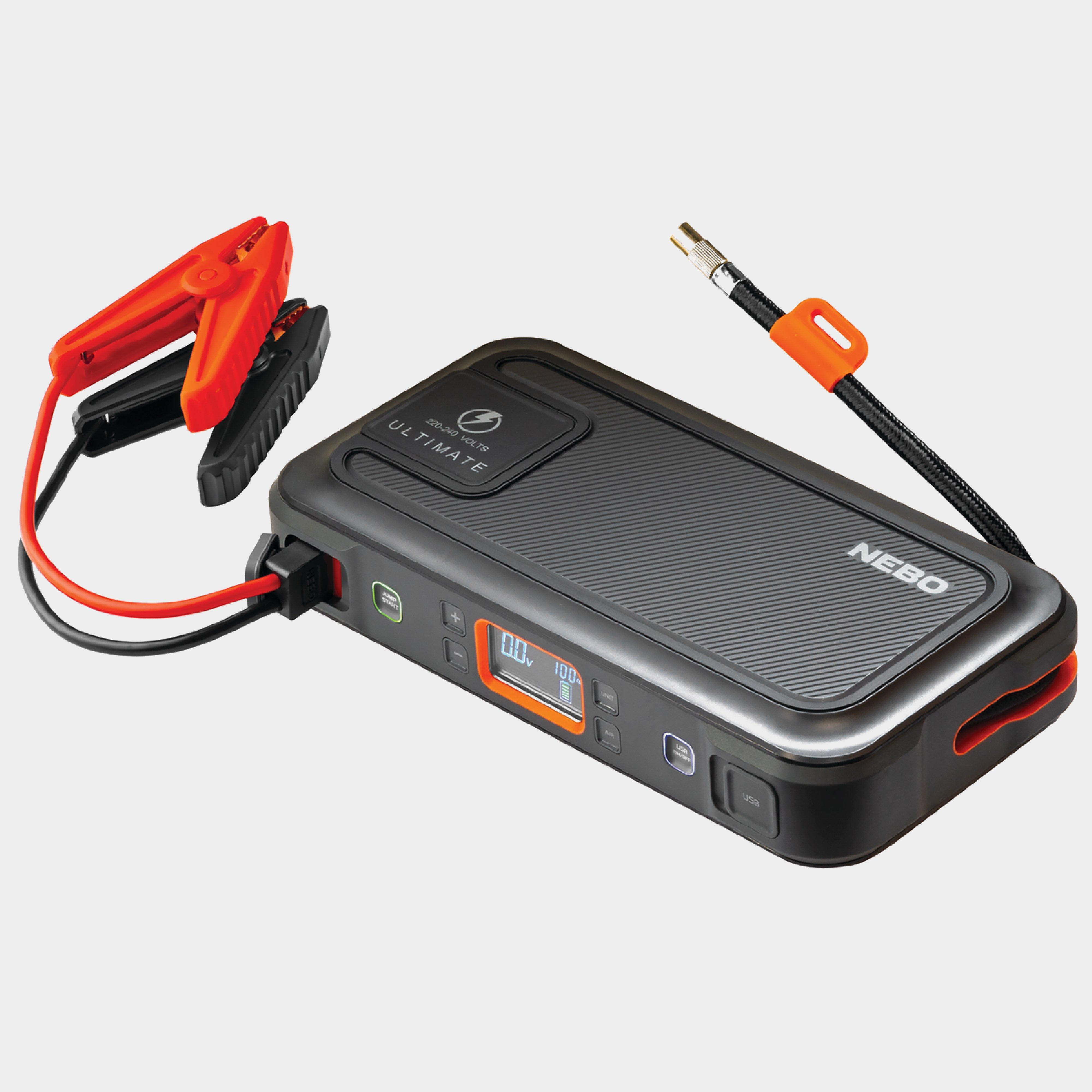 Introducing the Nebo Ultimate Multi Voltage Power Pack - the ultimate solution for power on the move.Packed with innovation and versatility, this powerhouse device ensures you're ready for anything life throws your way. Unparalleled multi-voltage capability: the Nebo Ultimate boasts a robust 220-240 volts AC mains outlet, delivering power to your essential devices wherever you may find yourself. Whether you're off the grid or facing a power outage, rest easy knowing the Nebo Ultimate has your back.Digital air compressor with 130 PSI: never be caught with a flat tire again. The integrated digital air compressor effortlessly inflates your tires up to 130 PSI, getting you back on your journey quickly and safely.Adaptable floodlight with multiple modes: illuminate your surroundings with our potent floodlight featuring three modes: high, low, and red flash. Whether you need bright, steady light or a signalling beacon, the nebo ultimate has the ideal setting for your situation. 1500 amps jump starter: never let a dead battery disrupt your plans. The Nebo Ultimate's 1500 amps jump starter ensures your vehicle springs to life effortlessly, so you can continue your journey without a hitch.Rapid and efficient charging: armed with a bi-directional ISB-C PD port, this power pack guarantees lightning-fast charging for your devices. Plus, dual USB-A ports enable you to power up multiple gadgets at once, ensuring you and your devices stay energized. Comprehensive accessories: with an array of assorted inflator valves, jump cables, and an air compressor extension hose, the Nebo Ultimate makes tackling various inflation tasks and jump-starting needs a breeze. Our included USB-C to USB-C charging cable ensures convenient power replenishment. Moreover, the UK 3-pin AC plug guarantees compatibility with local outlets.The Nebo Ultimate multi voltage power pack isn't just a device; it's your trusted companion for adventures, emergencies, and everyday life. Stay powered, stay secure, choose the Nebo Ultimate and enjoy unparalleled convenience and peace of mind wherever you roam.