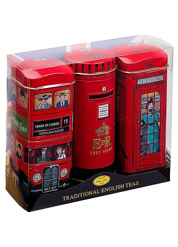 A delightful triple tea tin souvenir gift set featuring the authentic Red Routemaster Bus, English Post Box, and the iconic Red Telephone Box. These smart, collectible tins contain our flavoursome English Tea, a classic rich, smooth and delicious blend. Each tin contains 14 teabags. Traditionally used in the morning to invigorate the senses shortly after waking, this is a tasty brew which can be enjoyed on its own or with the addition of milk and if preferred a little sugar. Perfect to drink at any time of the day. An ideal gift.Tea Tins Contain:Bus tin contains 14 English Tea teabags.Post Box contains 14 English Breakfast teabags.Telephone Box contains 14 English Tea teabags.Infusion Tips:Boil fresh water to 100C and pour over the teabag. Leave the teabag to infuse for 5 minutes or longer if desired, for a fuller, stronger taste. Once the tea has finished steeping, immediately remove the teabag and stir.Brand: New English TeasTea