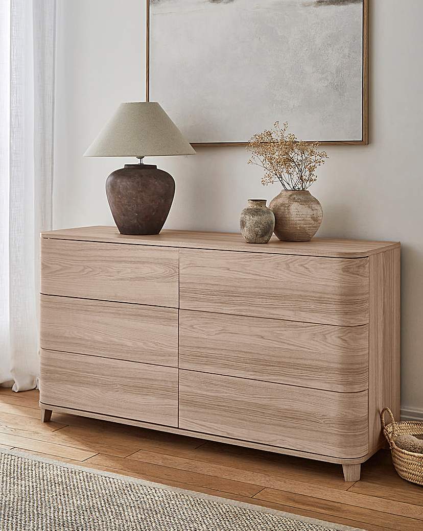 The Arden Small Chest of Drawers as 6 drawers finished with a curved sides and an oak effect. Self assembly required.