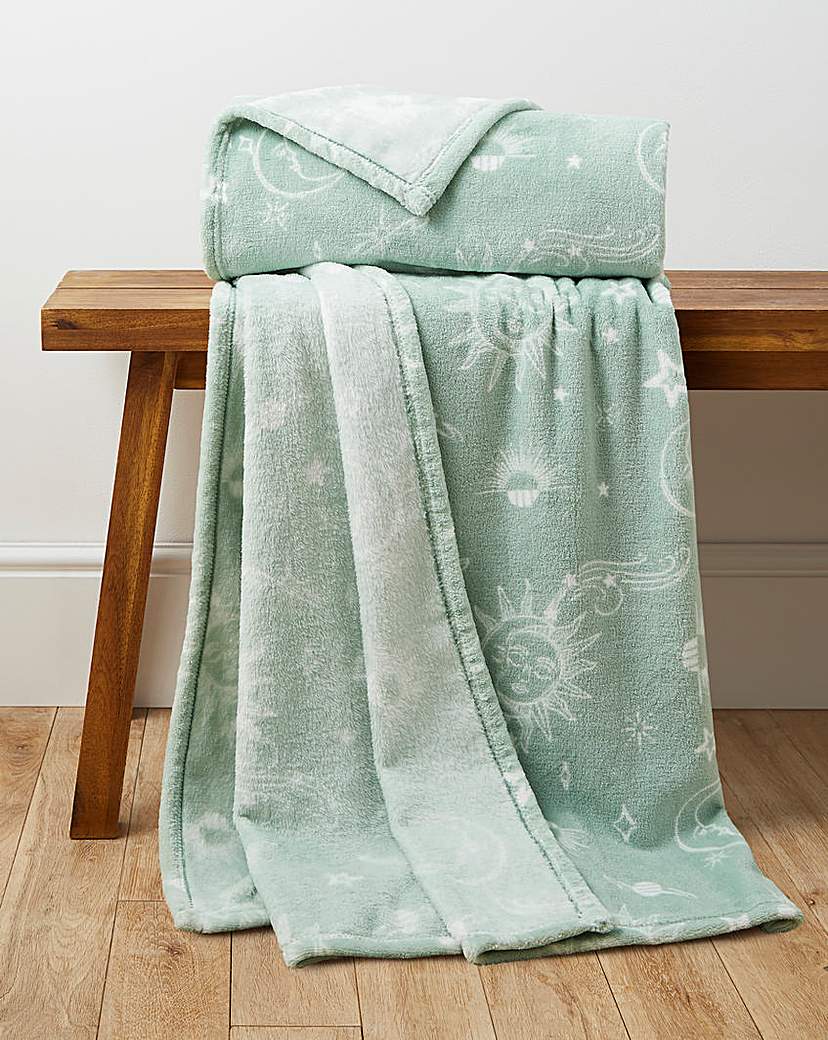 Embrace celestial comfort with this green fleece throw adorned with ancient sun god motifs. The soft coral fleece material offers supreme warmth suitable for all seasons. Crafted from high-quality coral fleece with a green base and white printed celeste patterns. Wash at 40C, Do not bleach, Tumble dry, Do not iron, Do not dry clean