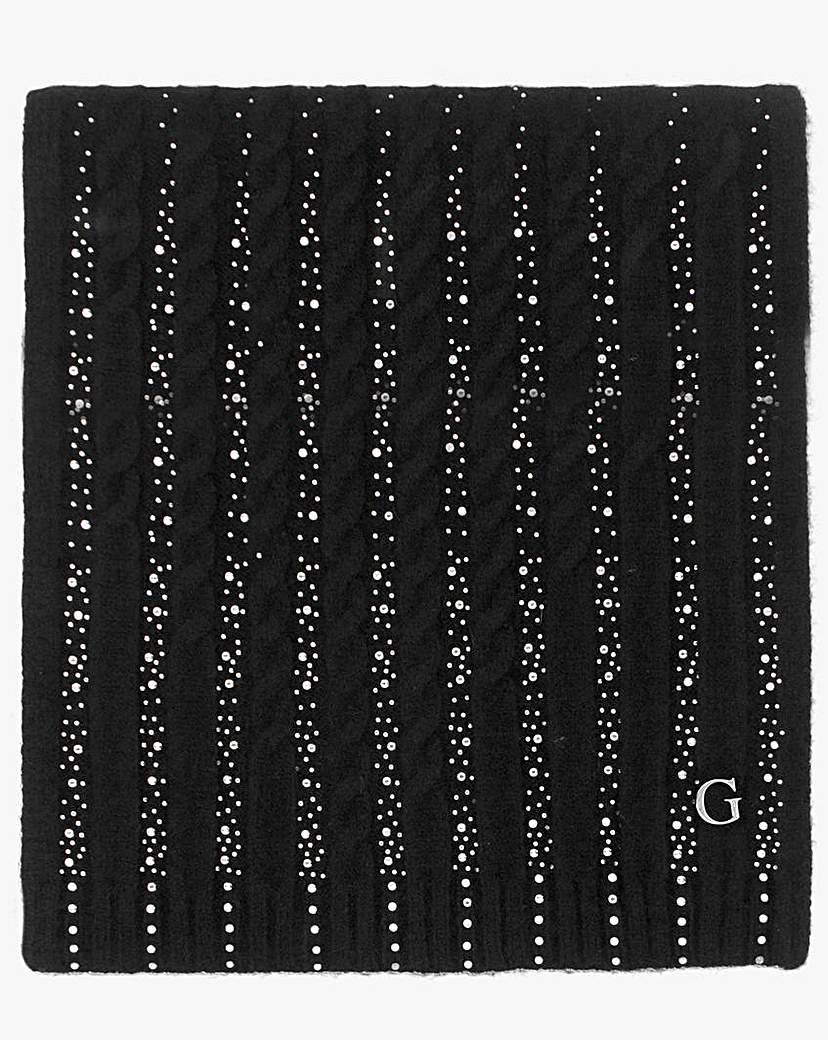 Guess Black Knitted G Logo Diamante Scarf Keep warm this Winter Season with the classic Guess Black Knitted G Logo Diamante Scarf. A premium mid-weight knitted rib design with cable inserts and diamante embellishment. Silver tone Guess 'G' logo completes the design. Technical information: Knitted, Ribbed Design, Cable Inserts, Diamante Embellished, G Logo, Guess Branding Dimensions: 30 x 165 CM