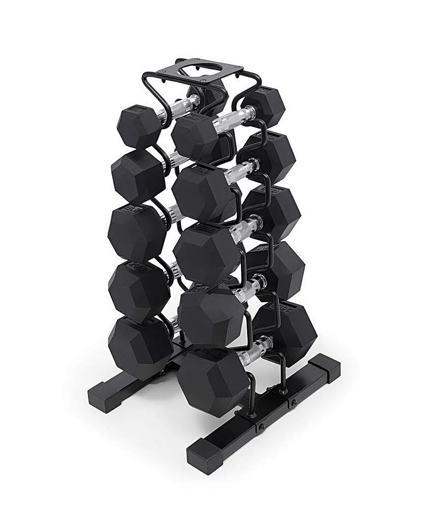 Storage Rack with Water Bottle Holder at the top. 5 Pairs of dumbbells: 5lbs (2.25Kg), 10lbs (4.5Kg), 15lbs 6.8Kg, 20lbs (9Kg), and 25lbs (11.3Kg).Solid cast iron core with a long-lasting nonrust chrome finish. Contoured ergonomic knurled grip prevents slipping. Hexagonal shape with durable rubber coating ends