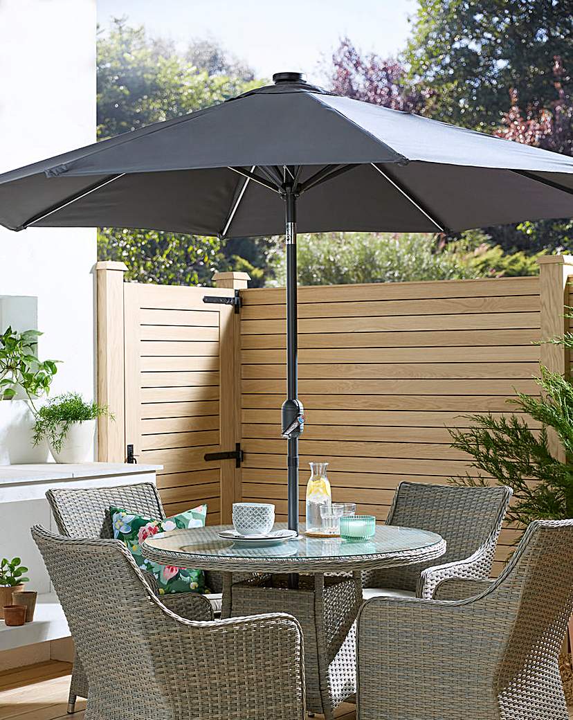 2.7m diameter parasol that is fitted on the underside with LED strip lights. With a Dark Grey canopy offering a neutral colour tone to your outdoor set up. Daylight charges the solar panel set at the top of the central pole, allowing the LED lights to give out a warm glow in the evening. Includes a tilt function allowing the parasol to be adjusted to suit during daytime and evening. A base is needed to maintain stability however is not included with the parasol. 1 Year manufacturers warranty.