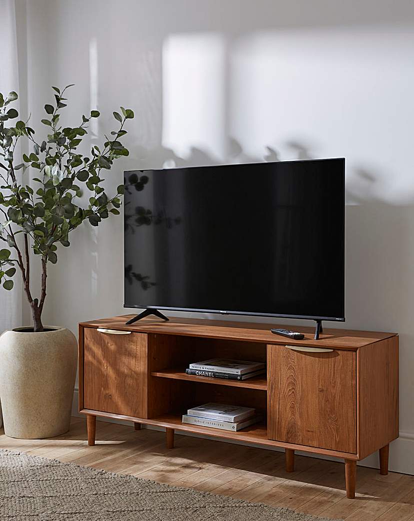 Westcote TV Unit. 2 cupboards for closed storage on both sides, 2 shelves for open storage in the middle, finished in a Walnut colour