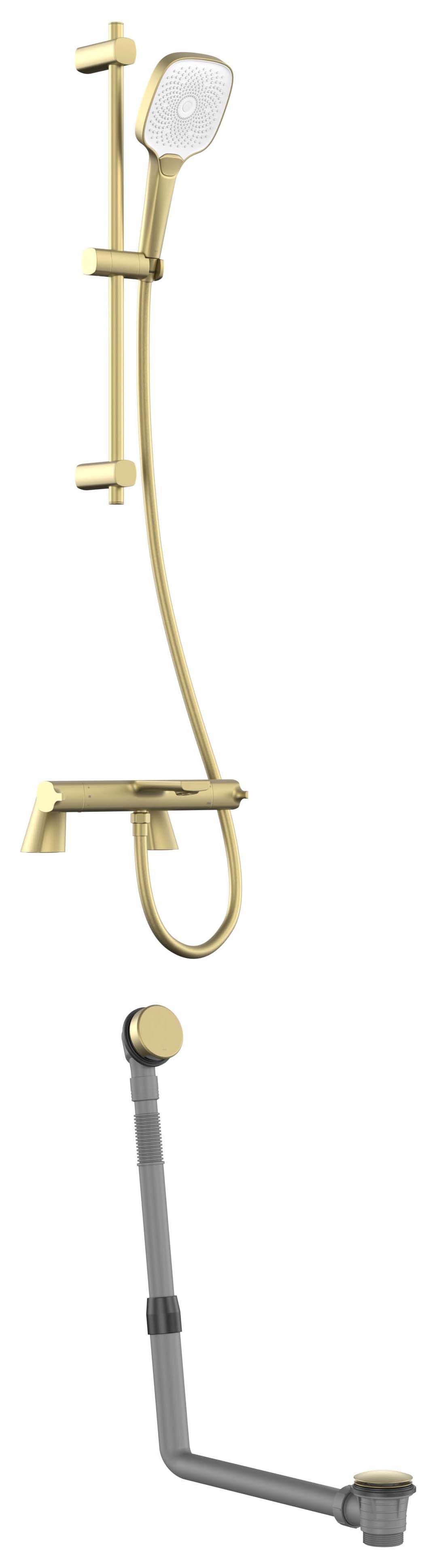 Nexa By VADO Veva Deck Mounted Exposed Thermostatic Bath Shower Mixer, Multifunction Slide Rail Kit & Bath Waste - Brushed Brass - This Veva dual-function package provides both a safe bathing and showering solution thanks to thermostatic technology preventing temperature fluctuations. It includes a deck mounted bath shower mixer, multi-function slide rail shower kit and a bath waste with overflow, all in your chosen finish.