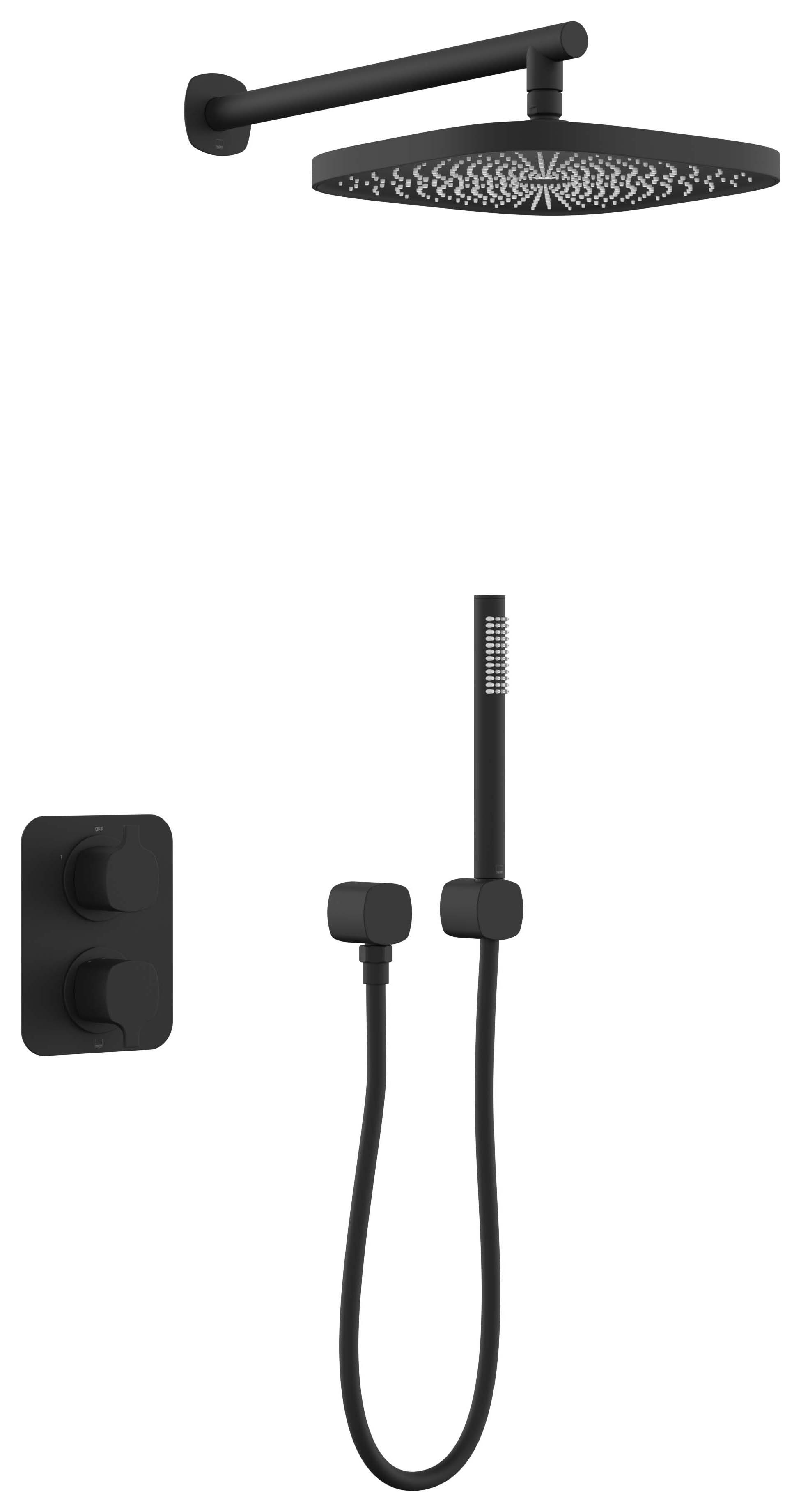 Nexa By VADO Veva Dual Outlet Concealed Thermostatic Mixer Shower Kit - Matt Black - This Veva dual-function shower package provides a safe showering solution thanks to thermostatic technology preventing temperature fluctuations. It includes a concealed two-outlet shower valve, wall-mounted fixed shower head and mini shower kit.