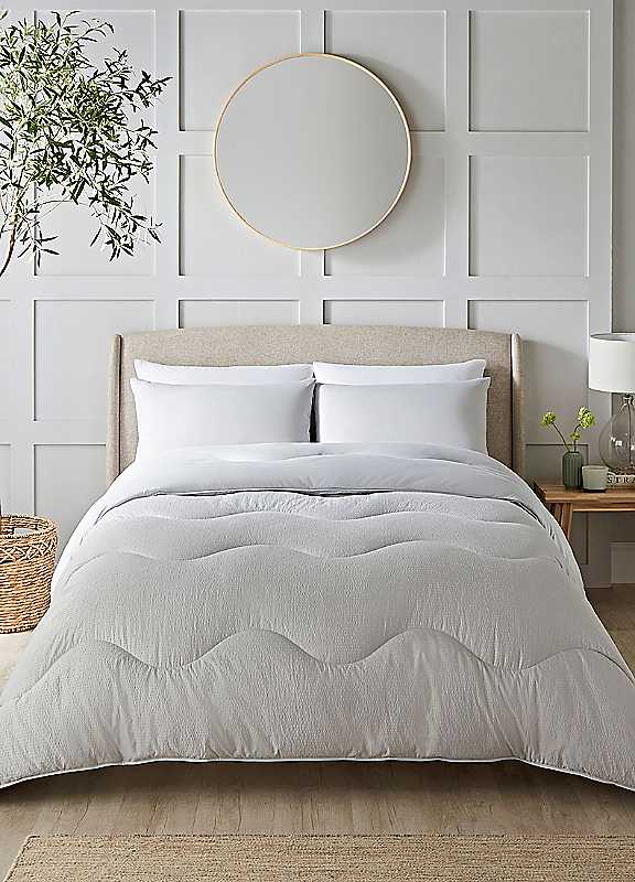Drift into cloud-like comfort with the Night Lark® Seersucker Coverless Duvet Set - the fuss-free bedding solution designed for effortless cosy nights. With a soft-touch sewn-in cover and matching pillowcase(s) included, there's no need for separate duvet covers or tricky changes. Simply wash and dry at home - it's machine washable and quick drying, making laundry day refreshingly easy.Designed with breathable Smartfil® fibres made from 100% recycled pet bottles, this duvet delivers lightweight warmth with a conscience. The classic seersucker texture adds a stylish, modern touch to any bedroom, while the super soft peachskin microfibre outer and bound edge finish give it a premium feel.Whether you're snuggling down for a restful sleep or setting up for last-minute guests, the Night Lark® coverless duvet is the perfect blend of comfort, convenience and sustainability - made in a zero-waste European factory powered by 100% renewable energy.Set includes: 1 x coverless duvet, 2 x pillowcases (1 x pillowcase with the single)CONVENIENCE - Just pop your Night Lark in the washing machine when ready to refresh, then quickly tumble dry for 90 minutesThat's it! Getting that fresh bedding feeling just got a whole lot easierCover: 100% Soft-Touch MicrofibreFilling: 100% Smartfil® Recycled Hollowfibre