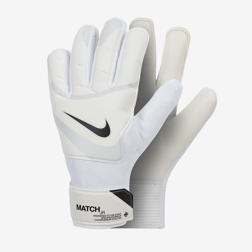 Help your side to victory with the Nike Kids GK Match in WhitePure PlatinumBlack, which are perfect for kickabouts or training with your team thanks to the smooth latex foam on the palm that creates grip in varied conditions. The Nike GK Match Goalkeeper Gloves feature plush padding to cushion your hands from ball impact and give grip on fastspinning balls in wet or dry conditions. A flat palm cut ensures maximum latex to ball contact as perforations at the fingers enhance airflow and the hookandloop wristband adjusts for a snug, secure fit. Nike kids Match goalkeeper gloves Smooth latex foam on the palm creates grip in varied conditions Mesh panels enhance airflow Strategic padding helps absorb ball impact Adjustable wristband for a snug, secure fit Materials 33 latex, 40 polyester, 21 EVA, 6 nylon