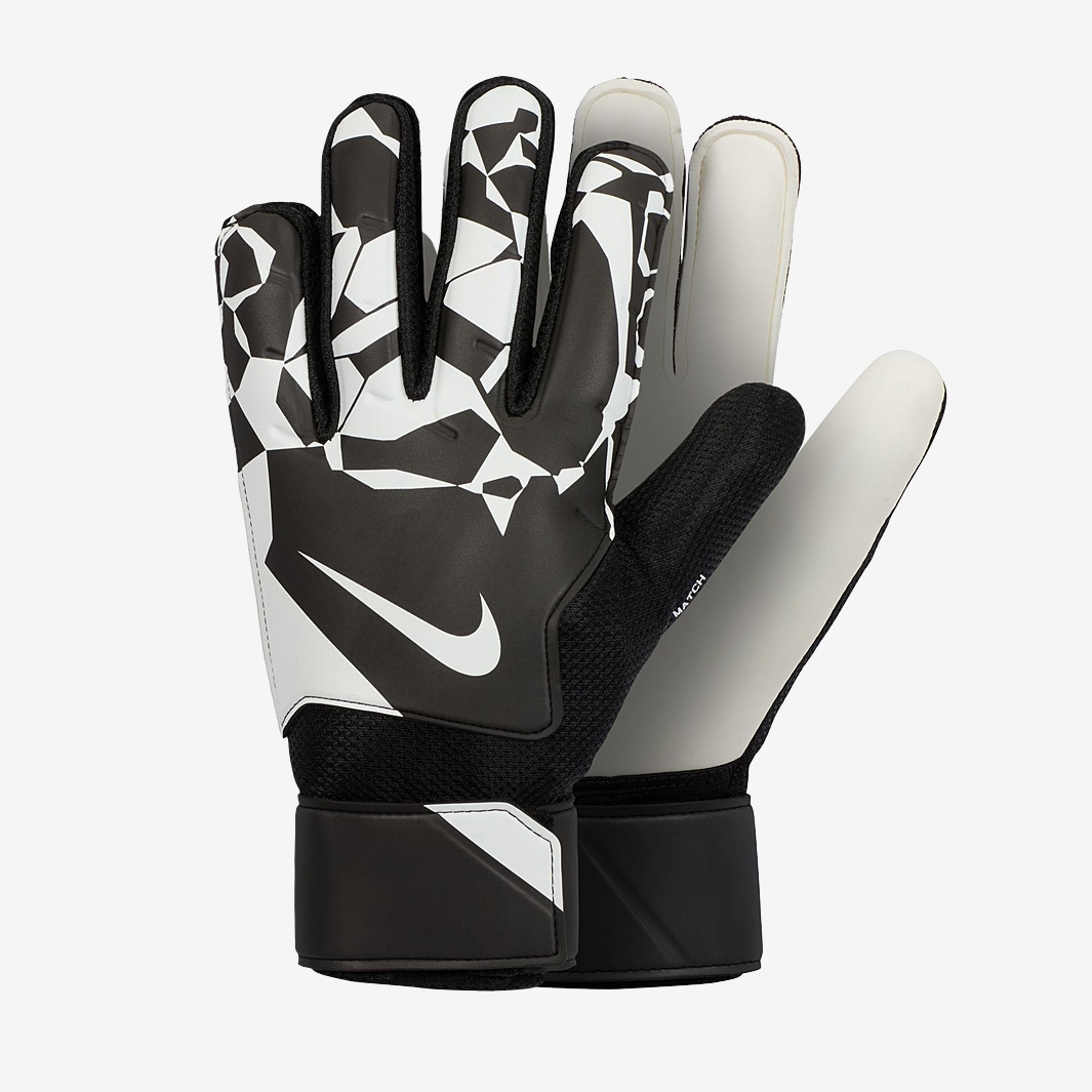 Help your side to victory with the Nike GK Match Goalkeeper Gloves in BlackWhiteWhite, which are perfect for kickabouts or training with your team thanks to the smooth latex foam on the palm that creates grip in varied conditions. The Nike GK Match Goalkeeper Gloves feature plush padding to cushion your hands from ball impact and gives grip on fastspinning balls in wet or dry conditions. A flat palm cut ensures maximum latex to ball contact as perforations at the fingers enhance airflow and the hookandloop wristband adjusts for a snug, secure fit. Smooth latex foam on the palm creates grip in varied conditions Mesh panels enhance airflow Strategic padding helps absorb ball impact Adjustable wristband for a snug, secure fit Materials 33 latex, 40 polyester, 21 EVA, 6 nylon