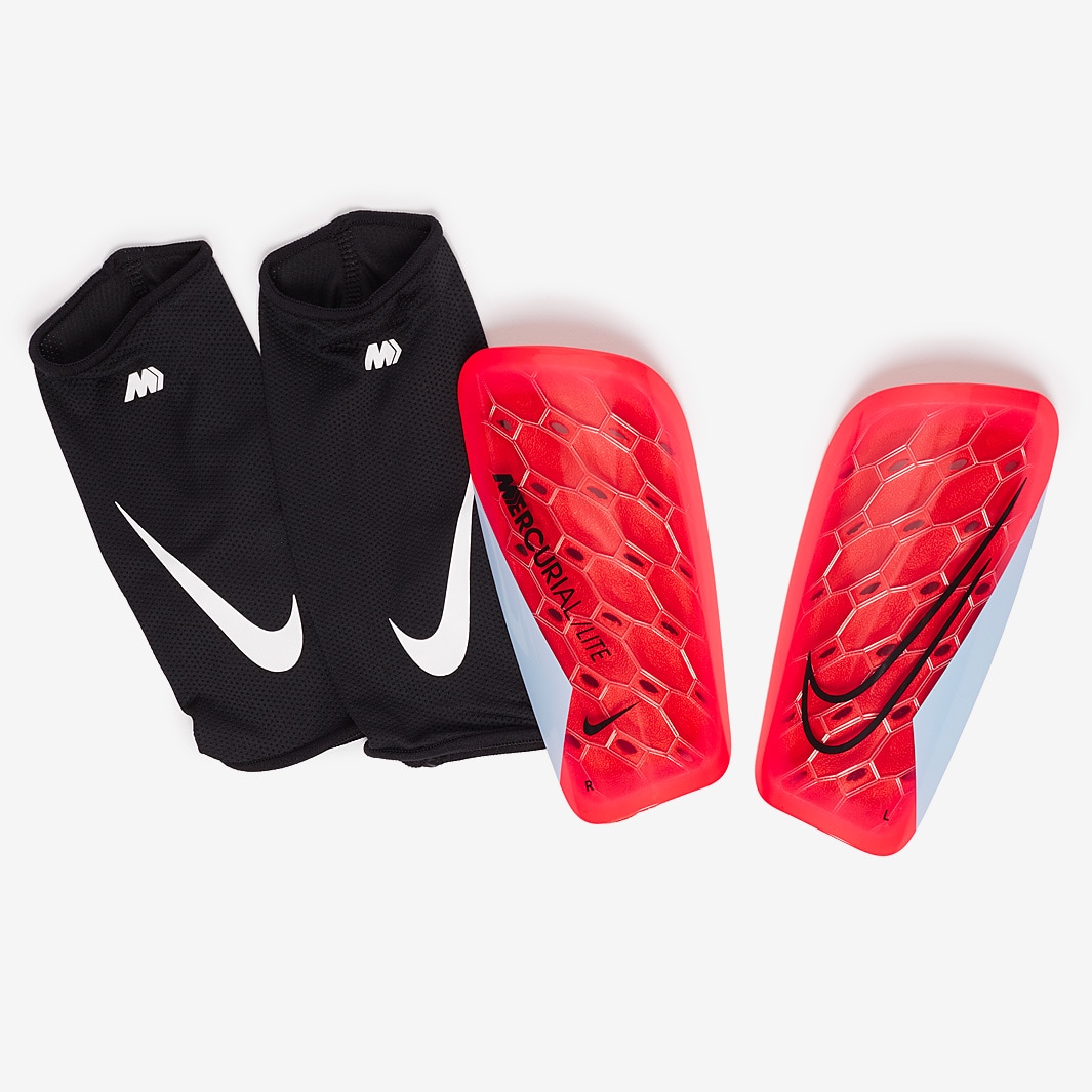 Play with confidence wearing Nike Mercurial Lite Shinpads in Bright CrimsonRoyal TintBlack, which come complete with stretchy sleeves to hold them in place. The pads are designed for Mercurial players, so theyre lightweight and lowprofile, featuring soft, perforated EVA cushioning to absorb impacts. DriFIT technology moves sweat away from your skin for quicker evaporation, helping you stay dry and comfortable. Nike Mercurial Lite shin guards Lowprofile shell is lightweight and durable Soft, perforated foam helps cushion against impact DriFIT sweatwicking technology Stretchy sleeves help hold the guards in place Sleeve 65 polyester, 19 rubber, 16 elastane Shell 72 K resin, 28 EVA Hand wash
