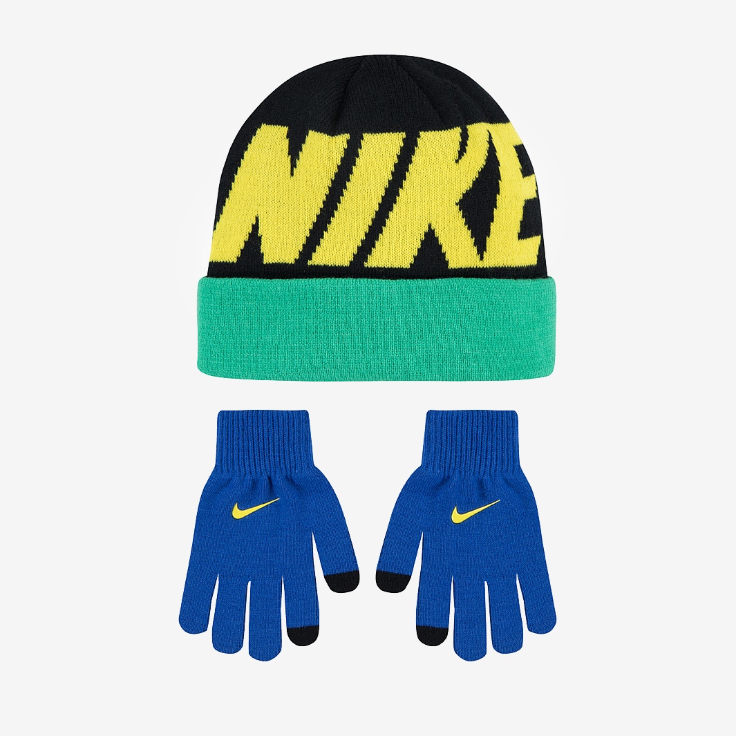 Keep your little one cosy and comfortable in the cooler weather with the Nike Sportswear Kids Wordmark Colourblock Beanie Set in Black, the twopiece set featuring index fingers and thumbs with touch screen conductive yarns so they can use their devices outdoors without exposing their hands to the elements. The Nike Sportswear Kids Wordmark Colourblock Beanie Set consists of a beanie thats made of soft knit fabric that helps to help retain warmth, with matching gloves that are made of stretchy yarns for a comfy fit. A wordmark logo on the hat and Swoosh logos to the gloves complete any outfit with signature sporty style. Beanie hat showcases a colourblock design with a Nike graphic Matching gloves have conductive thumb and index fingertips, making them compatible with touch screen devices Hat 94 acrylic, 5 nylon, 1 elastane Gloves 86 acrylic, 13 polyester, 1 elastane