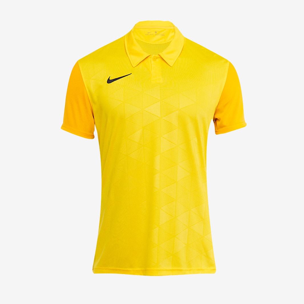 Give your team a new identity with the Nike Trophy IV SS Shirt in Tour YellowUniversity GoldBlack, a football shirt that catches the eye with its modern graphic styling and classically inspired collar. The Nike Trophy IV SS Shirt is a classic modernday football shirt with its technology and design befitting for any team going for glory. Ventilation is helped by the tops mesh side stripes and back panel, whilst it also incorporates Nikes DriFIT technology that wicks moisture away from your skin as you play, keeping you cool and dry when you need it most. The slim fit gives the shirt a comfortable and tailored feel, whilst the classic buttoned collar improves fitting around the neckline. DriFIT technology keeps you dry and comfortable Mesh side stripes and back panel add breathability Slim fit for a tailored feel Classic collar with 1button placket Sublimated tonal graphic 100 polyester This product is made with at least 50 recycled polyester fibres