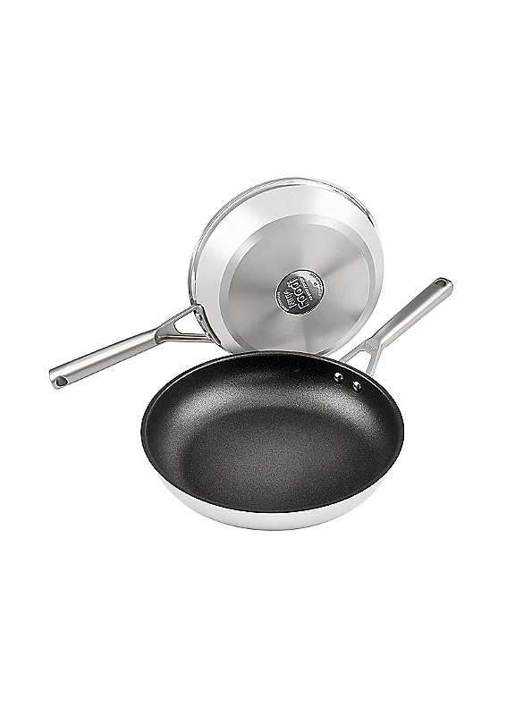 This Ninja ZEROSTICK Stainless Steel frying pan set is perfect for confident chefs and kitchen newcomers alike. Zero stick, chip or flake:Whereas other pans can rapidly lose their non-stick performance, Ninja ZEROSTICK is up to 20x tougher than traditional non-stick*. Durable, long-lasting, and covered by Ninja's 10 Year Replacement Guarantee, including the ZEROSTICK coating**. Stainless steel collection:The best of both worlds, this elegant range is expertly crafted from polished stainless steel with an aluminium core, delivering even heat distribution and excellent high-heat searing. Complete with cast stainless steel handles that are comfortable to hold, it makes the perfect choice for confident chefs, kitchen newcomers and style-conscious cooks. The difference is in the degrees:ZEROSTICK is precision engineered at 17,000°C, fusing plasma ceramic particles to the surface of the pan to create a robust textured surface that interlocks with Ninja's exclusive coating. The extremely durable, textured cooking surface is metal-utensil safe, scratch resistant and dishwasher safe for easy cleaning. PFOA, lead and cadmium free. 10-Year Guarantee:Covered by Ninja's 10 Year Replacement Guarantee, including the ZEROSTICK coating**. Cook using little to no oilExclusive to Ninja, ZEROSTICK stops food from sticking day after day, so your creations easily slide from the pan to your plate. Use little to no oil for a healthier way to cook, without compromising on cooking performance - sear like you can in stainless steel, without sticking. Induction compatible:Designed to withstand high-heat cooking, even heating and no hot spots deliver consistent results - perfect for cooking crispy bacon, sizzling steaks, golden pancakes and scrambled or fried eggs, exactly as you like them. Induction compatible:Suitable for all hob types including induction, gas, electric and ceramic. 24cm Frying Pan (suitable for 17.75cm induction ring) 28cm Frying Pan (suitable for 20.25cm induction ring) Oven safe to 260°C:Start your creation on the hob, finish to perfection in the oven. The oven-safe tempered glass lids have a thick stainless-steel rim, prevent splatter and lock in moisture while ensuring maximum visibility. *3rd party test lab coating abrasion testing 2022**Upon registration with Ninja. When used as directed in the use and care guide.