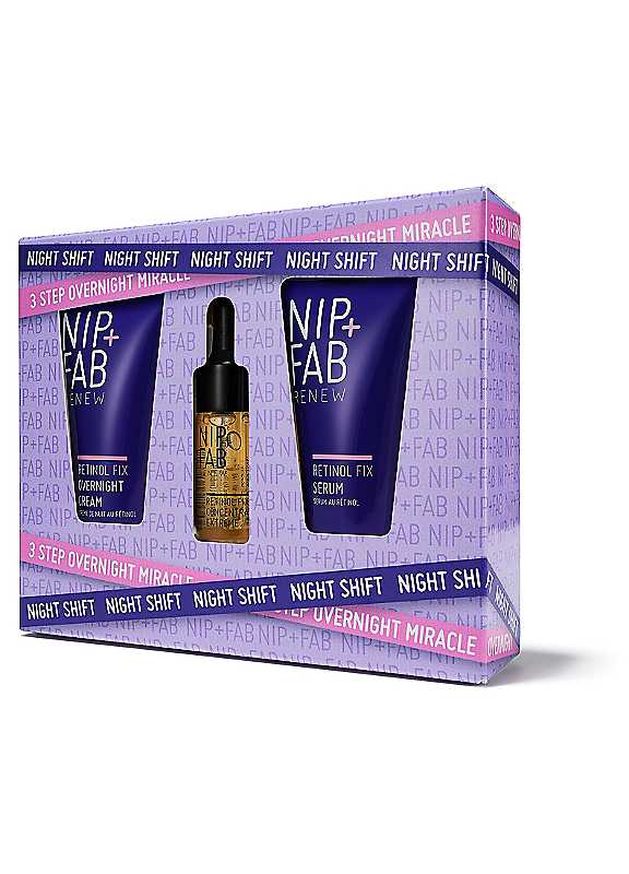 The set contains 3 large deluxe sized products, these are not your average mini product. It includes Retinol Fix Concentrate 10ml (1/3 the size of our full sized product), plus our Retinol Fix Serum 20ml and Retinol Fix Overnight Cream 20ml, both 40% the size of our full sized products. If all 3 products are used every night, the set contains between 2-4 weeks of use depending on application volume, however we generally advise to start using retinol just 3 nights a week and building up from there. This will allow you to identify your skin's tolerance levels and the right mix of products used alongside for maximum results. Nip + Fab Retinol Fix uses balanced, multi ingredient formulas to deliver results, these are not single active ingredient products, they have all-round benefits with a focus on accelerating collagen production in the skin and balancing this with continued hydration. Developed for gentle but effective results, they are suitable for first time retinol users in isolation or layered for an experienced retinol user. The set allows you to trial the textures and get a feel for what's right for your skin. What's included?- Retinol Fix Concentrate 10ml: A water-like concentrate which absorbs super quickly as your first layer post cleansing. Retinol Fix Serum 20ml: A balm-like serum which works beautifully on dehydrated and more mature skin types. Retinol Fix Overnight Cream 20ml: A lightweight but intensely hydrating overnight cream texture, the perfect final layer before bed. How To Use: Incorporate these products into your evening skincare routine based on your experience with retinol For seasoned retinol users - Cleanse After a single or double cleanse in the evening, ensure your skin is free from dirt & makeup. We recommend using our Ceramide Fix Cleansing Balm. Apply Retinol Fix Concentrate Apply the Retinol Fix Concentrate across your face & neck. Follow with Retinol Fix Serum: Layer your routine with a serum to enhance hydration & treatment. Finish with Retinol Fix Overnight Cream: Complete your routine by applying an overnight cream to lock in moisture. Frequency: Start with 3 nights per week, gradually increasing as your skin adapts & benefits. Important: Always wear SPF the following morning after using retinol to protect your skin from sun sensitivity. For first-time retinol users - Cleanse: Start with a thorough cleanse to prepare your skin for the routine. We recommend using our Ceramide Fix Cleansing Balm. Apply Retinol Fix Concentrate: Gently apply the Retinol Fix Concentrate across your face & neck. Follow with Hydrating Serum: Use a hydrating serum such as our Hyaluronic Fix Extreme4 Serum 2% to nourish & plump your skin. Finish with Barrier-Supporting Night Cream: Apply a barrier-supporting cream like Ceramide Fix Overnight Cream 12% to soothe & protect your skin overnight. Frequency: Use this routine 2-3 nights a week. As your skin becomes more tolerant, replace your serum & night cream with the Retinol Fix Serum & Retinol Fix Overnight Cream to further boost your results. mportant: Always wear SPF the morning after using retinol to protect your skin. | retinol night cream, night face care, retinol brightening serum, retinol sensitive skin, skincare products set, overnight skin treatment, skincare for 40s, uneven skin tone, hydrating face cream, night skin care, glass skin routine, dry skin face
