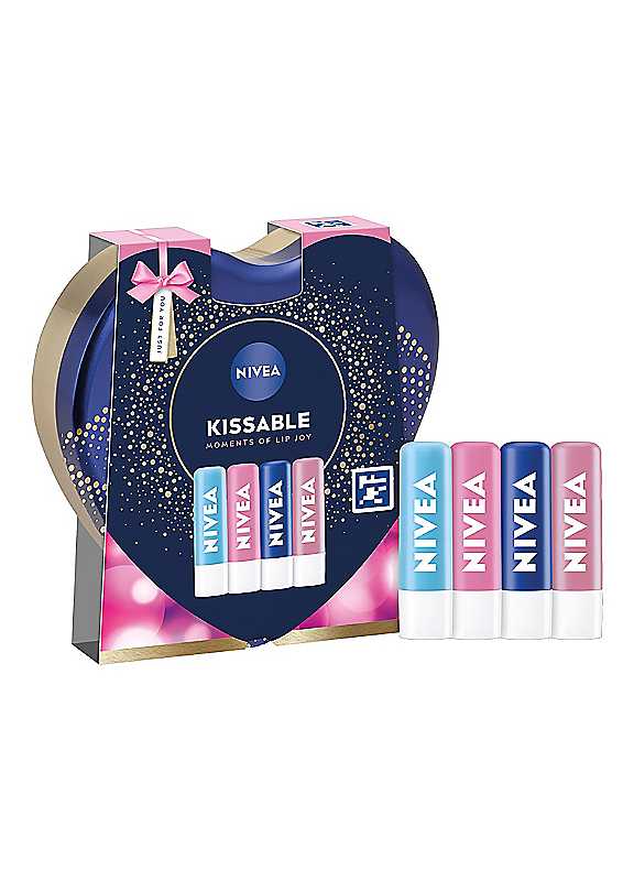 The NIVEA KISSABLE MOMENTS OF LIP JOY collection features four nourishing lip balms, beautifully packaged in a charming heart-shaped keepsake tin. A fun and thoughtful stocking filler for soft, kissable lips all year round! The full gift set includes:- Our NIVEA Hydro Care Caring Lip Balm 4.8g, includes SPF 15 to protect your lips whilst keeping them hydrated and moisturised.- Our NIVEA Pearly Shine Caring Lip Balm 4.8g, the caring formula keeps your lips moisturised for 24 hours and is enriched with Pearl Extract for a glamorous shiny touch.- Our NIVEA Original Care Caring Lip Balm 4.8g, enriched with Shea Butter and natural oils, to keep your lips smooth and moisturised all day.- Our NIVEA Soft Rose Caring Lip Balm 4.8g, enriched with Shea Butter instantly melts into your lips and keeps them moisturised for 24 hours, while enhancing the natural rosiness of your lips.- Plus a fun heart shaped keepsake tin. - Contains full sized products- Our NIVEA Gift packaging is; 100% plastic free, Made from FSC Cardboard only, Printed using Mineral Oil free inks. | lip care skincare, nourishing lip balm, skincare gift set