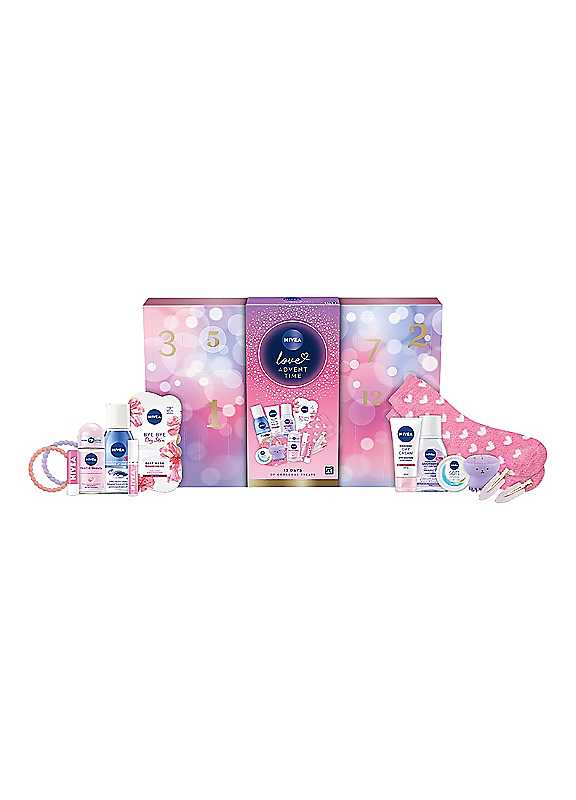 What's behind door number one? 12 days of festive NIVEA joy! Get into the holiday spirit with our NIVEA LOVE ADVENT TIME, featuring 12 delightful surprises. Perfect for treating yourself or gifting someone special, each door reveals a little festive magic to brighten your season. Let the countdown to Christmas begin with a little extra love every day! This Advent Calendar contains:- Our NIVEA Double Effect Waterproof Eye Make-Up Remover 125ml, the waterproof formula with Biotin cares for eye lashes whilst removing eye make-up.- Our NIVEA Nourishing 24h Moisture Day Cream SPF15 50ml, the formula with Natural Almond Oil deeply nourishes and smoothens skin whilst protecting your skin with SPF 15.- Our NIVEA Soothing Micellar Water Sensitive Skin 100ml, a soothing formula with Amino Acid Complex + DEXPANTHENOL, effectively removes make-up whilst having a calming effect.- Our NIVEA Pearl & Beauty Anti-Perspirant Roll-On 50ml, reliable 72h anti-perspirant protection with a lasting fragrance of delicate florals.- Our NIVEA Soft Rose Caring Lip Balm 4.8g, enriched with Shea Butter and enhances the natural rosiness of your lips.- Our NIVEA Candy Pink Caring Lip Oil 5.5ml, provides instant moisture whilst giving your lips a glossy, Candy Pink finish.- Our NIVEA Soft Moisturising Cream 25ml, a refreshingly soft moisturising cream for everyday use on face, hands and body.- Our NIVEA Bye Bye Dry Skin Nourishing Face Mask Dry Skin 2 x 7.5ml, a nourishing face mask for dry skin with Honey & Natural Almond Oil.- Plus, a pair of soft fluffy socks, face cleanser, get ready hair clips & 2x hair bands. - Our NIVEA Gift packaging is; 100% plastic free, Made from FSC Cardboard only, Printed using Mineral Oil free inks. | christmas stockings, stockings for ladies, winter stockings, christmas fluffy socks, bath body christmas, ladies gift sets, christmas accessories, hair clips makeup, christmas hair accessories, hair gift set, multicolor scrunchies, festive hair accessories, pastel scrunchies