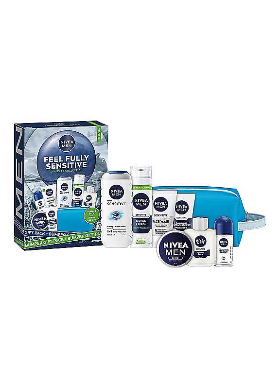 Treat someone special this Christmas with the NIVEA MEN FEEL FULLY SENSITIVE bumper gift set - a complete collection of skincare essentials for sensitive skin. Packed with NIVEA MEN's most-loved Sensitive range and a stylish wash bag, it's the perfect way to elevate their grooming routine. The full gift set includes:- Our NIVEA MEN Sensitive Face Wash 100ml, with Vitamin PRO Complex is a mild yet effective face wash that leaves your skin feeling refreshed while removing dirt and excess oils.- Our NIVEA MEN Sensitive Protect Anti-Perspirant Roll-On 50ml, the gentle formula with Chamomile Extract and Avocado Oil is especially developed for sensitive skin.- Our NIVEA MEN Sensitive Moisturiser 75ml, the alcohol-free* formula with Vitamin E, Provitamin B5 and Chamomile Extract provides daily skin care for 5 signs of healthy-looking skin: relief from irritation, 24h hydration, smooth & soft skin, less sensitivity and daily skin comfort. *no Ethyl Alcohol- Our NIVEA MEN Sensitive Shower Gel 250ml, the mild & caring formula with Bamboo extracts, soothes and gently cleanses sensitive skin.- Our NIVEA MEN Sensitive Shaving Foam 200ml, which protects against the 5 signs of irritation with a 0% alcohol* formula enriched with Chamomile, Vitamin E, and Witch Hazel for a smooth, comfortable shave. *no Ethyl Alcohol- Our NIVEA MEN Sensitive Post Shave Balm 100ml, delivers instant relief and 24h hydration with a non-greasy, fast-absorbing formula. Enriched with VitaminPRO Complex for healthy-looking, comfortable skin - every day.- Our NIVEA MEN Creme 75ml, cares for your skin by giving it a boost of hydration and prevents it from drying out. The light formula is non-greasy and absorbs quickly and is ideal for face, body and hands.- plus a practical washbag to keep his skincare essentials organised at home or on the go. - Contains full sized products- Our NIVEA Gift packaging is; 100% plastic free, Made from FSC Cardboard only, Printed using Mineral Oil free inks.