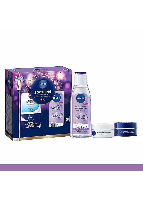 Experience ultimate care with the NIVEA SOOTHING MOMENTS OF JOY Essentials Day & Night Routine. This pack includes three must-have skincare essentials, designed to hydrate and soothe your skin around the clock. The perfect routine to keep your skin soft and cared for. The gift set includes:- Our NIVEA Soothing Micellar Water 200ml, that cleanses, removes makeup, and hydrates your skin without leaving any residue.- Our NIVEA Refreshing Day Cream SPF 30 50ml, helps prevent premature aging, intensely moisturises for 24 hours, and plumps the skin with fast-absorbing moisture.- Our NIVEA Moisturising Night Cream 50ml, provides 24-hour moisture, promotes natural skin regeneration, and deeply nourishes for a refreshed look. - Contains full sized products- Our NIVEA Gift packaging is; 100% plastic free, Made from FSC Cardboard only, Printed using Mineral Oil free inks. | micellar water sensitive, skincare products women, skincare night cream, hydrating face cream, hydrating facial cleanser, skin care routine, amino acid skin, face wash moisturizer set