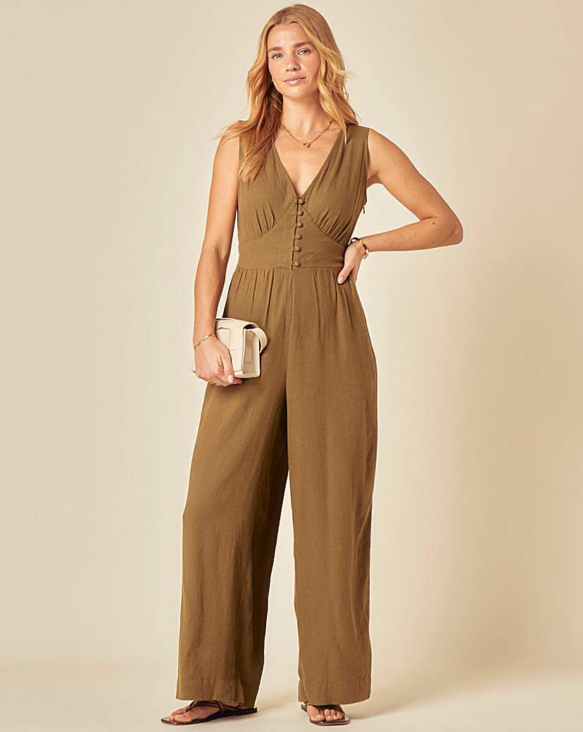 Starlight, but a jumpsuit version. In an earthy khaki colour, our jumpsuit features a v neckline and flattering empire waistline. She falls to an effortless wide leg. Just add sandals.