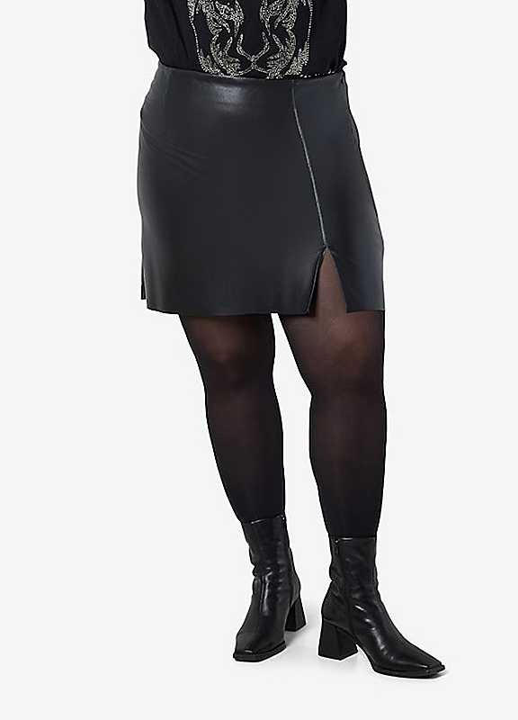 Faux leather skirt, high waisted, mini length with a front split and zip fastening.Gentle wash at 30°C maxDo not tumble dryLine dry in the shadeDo not ironDo not dry clean100% Polyester (Polyurethane Coated)