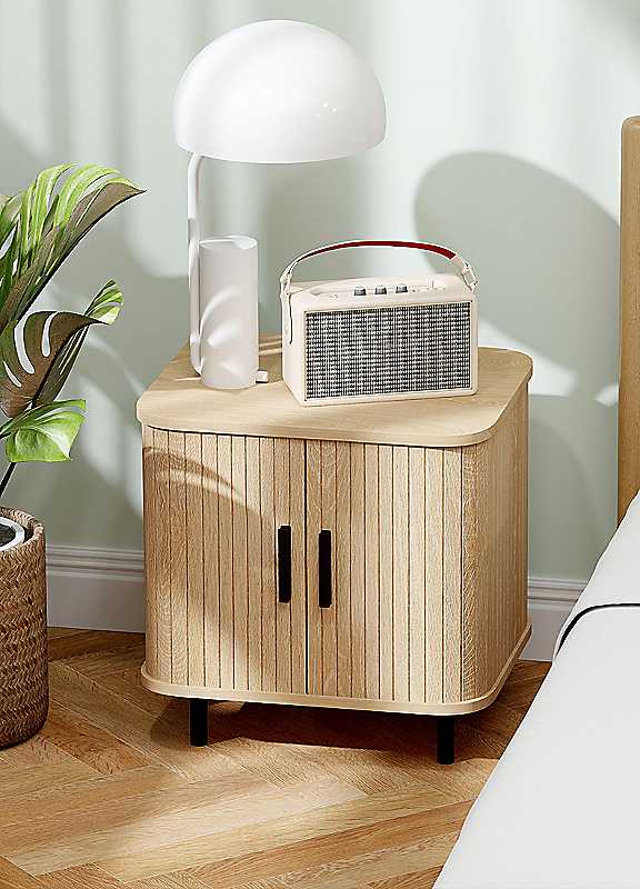 Stylish, space-efficient, and sturdy - this roller shutter nightstand is the perfect fusion of Scandinavian aesthetics and everyday practicality. Elevate your bedroom with this bedside table, designed in a Nordic-inspired style with distinctive roller shutter sliding doors. Its smooth, space-saving design adds a touch of modern sophistication while keeping your essentials neatly tucked away. Featuring a two-tier interior, this nightstand offers generous storage for books, devices, and d©cor - helping you maintain an organised, clutter-free space. Crafted from durable particleboard and supported by sturdy steel legs, this side table can hold up to 90 kg in total. The melamine coating resists scratches, while protective foot pads prevent floor damage. With its elevated base for effortless cleaning and compact frame, it works perfectly as a bedside table, end table, or sofa companion in any modern home.Height to Floor: 9.5 cmOverall Load Capacity: 90 kgTop Compartment Load Capacity: 30 kgAssembly RequiredMDF, Particle Board, SteelOverall dimensions approx. 48W x 40D x 48H cmCompartment dimensions approx. 29W x 33D x 16.5H cm