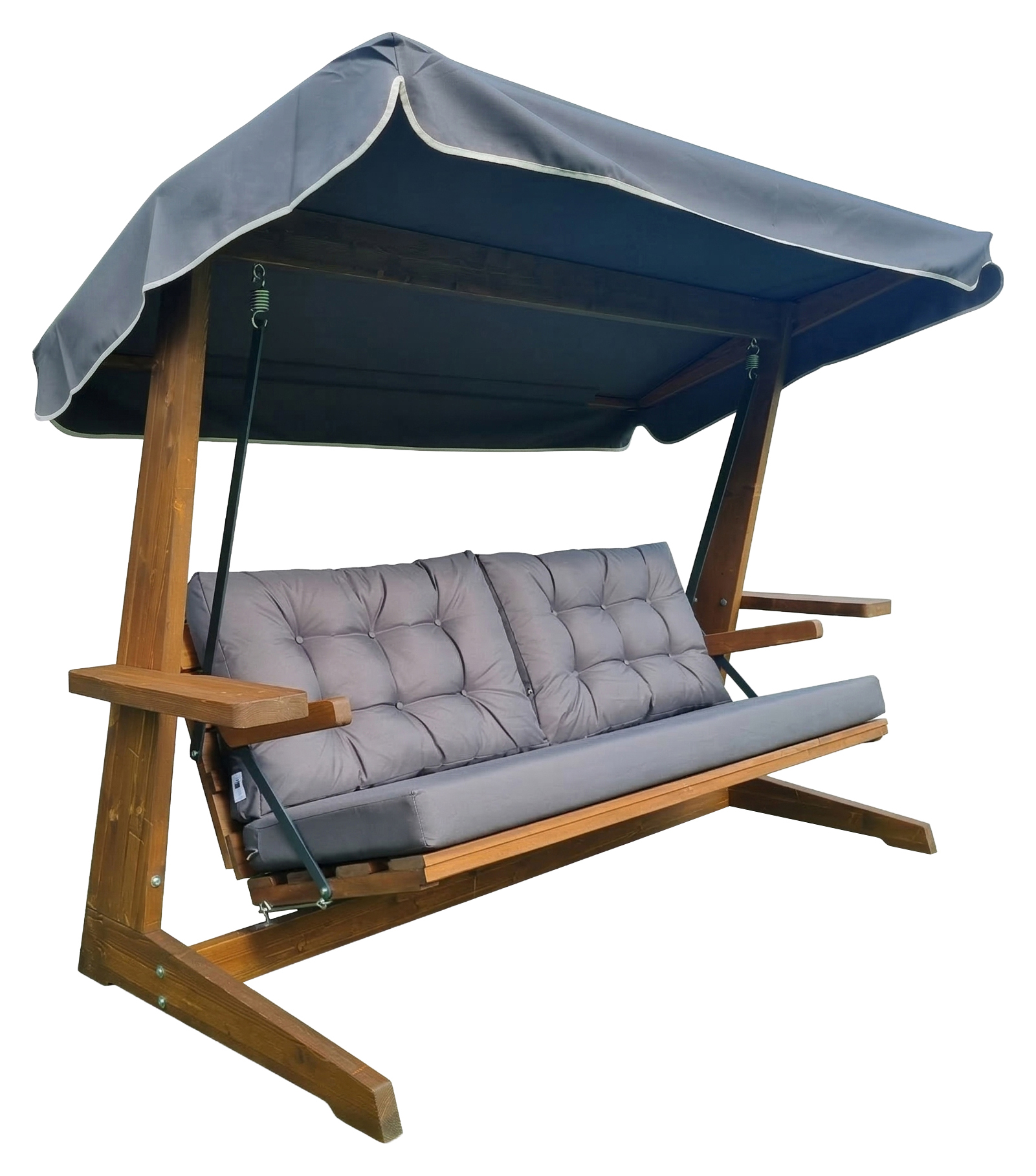 Norfolk Leisure Brestwick 2400 Pine Mix 3 Wooden 3 Seater Swing Seat with Anthracite Cushions - Brestwick Three Seater Swing Set, a timeless piece stained in a red oak colour to give it a stand out appeal, complete with wide side tables and a fully adjustable 80+ UV protected canopy. Water-repellant and stain resistant fabric on the canopy. Luxuriously comfortable cushions built with ecotex certified polyester. Can comfortably seat up to three people. Dimensions: 237cm x 115xm x 175cm, responsible sourced timber from certified forest.