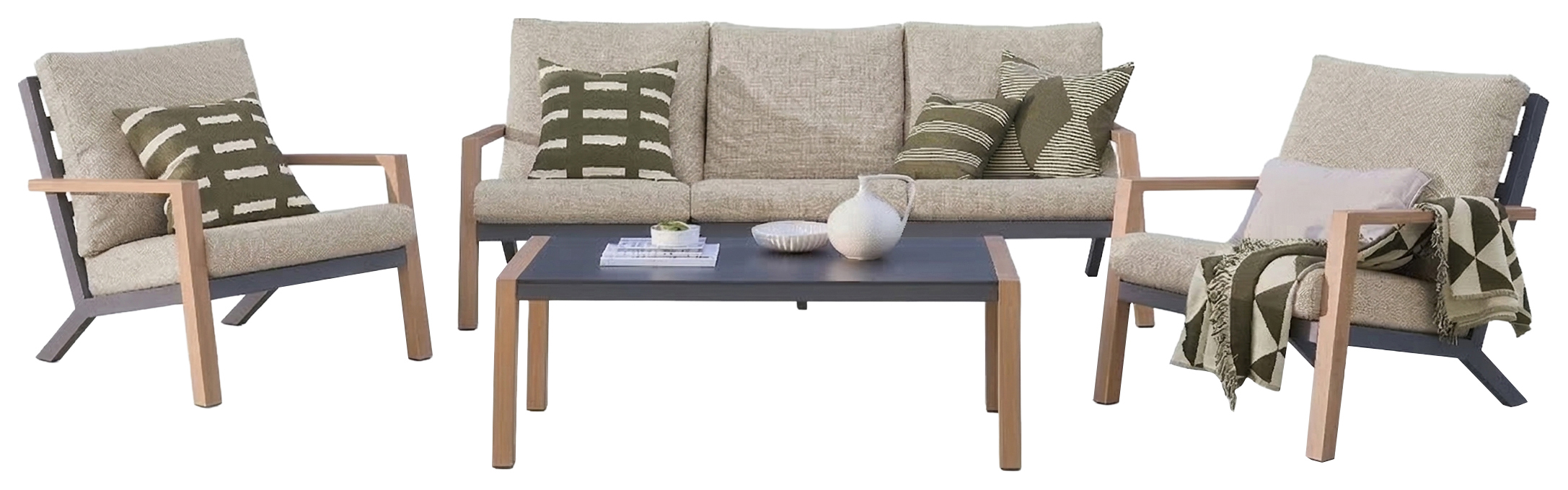 Norfolk Leisure Melford 3 Seater Sofa Set - Cappuccino Cushion - One of the most stand out pieces of the new Norfolk Collection range. The Melford Lounge Set is a blend of modern sophistication and practical design. Built with a powder-coated aluminium frame and contemporary contrasting heat-transfer wood-look arms and legs. The coffee table features wood-look contrasting frame with a matt black ceramic composite glass top. Completed with easy-care, shower-resistant, stain-resistant cappuccino cushions.