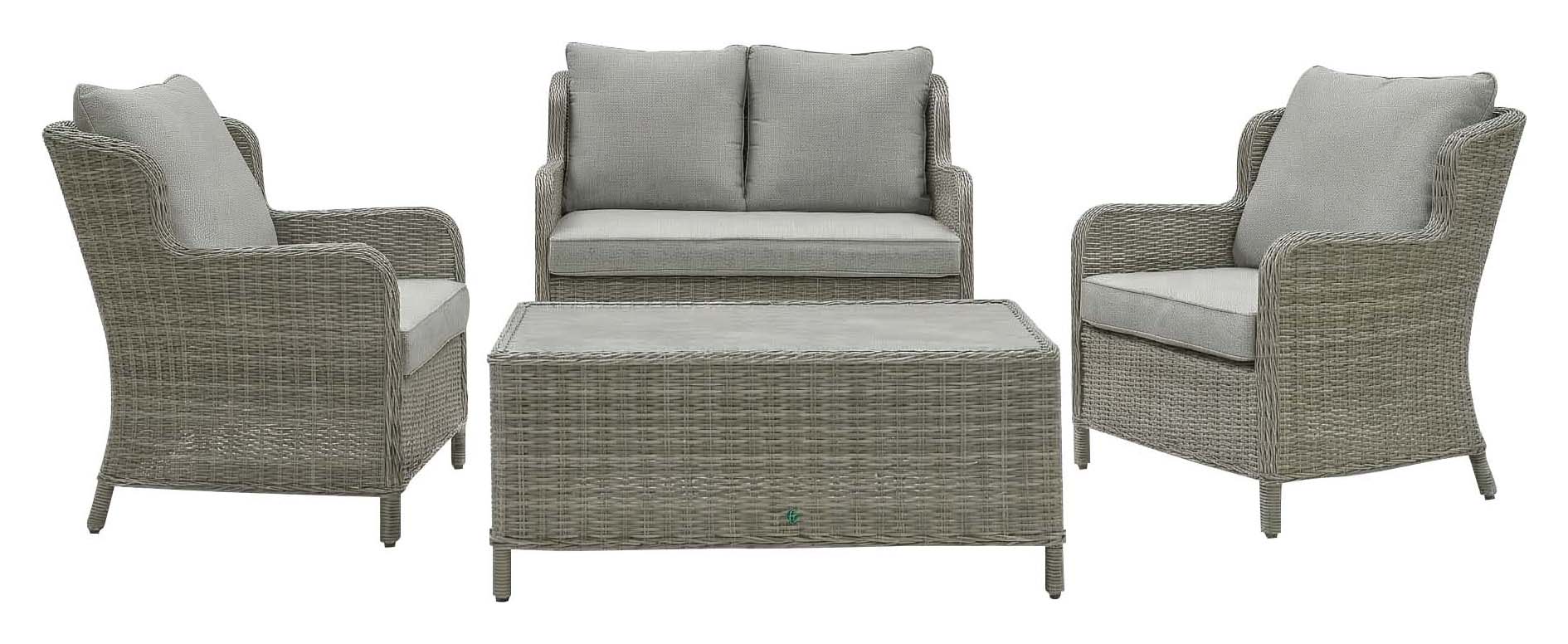 Norfolk Leisure Vienna Beige Lounge Set - Vienna Lounge Set, an elegant enhancement for your outdoor or indoor living area. Wide half-round weave synthetic rattan combines modern practicality and easy care with the traditional furniture appeal of weave, providing an inviting setting for relaxation or socialising. The tempered glass table top comes with a printed ceramic effect, scratch resistance without the added extra weight.