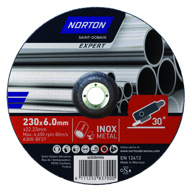 Contains three fibreglass reinforcements to withstand high side-load pressure for chamfering, grinding and deburring. This grinding disc is built to last with a long product life and optimised bond system. It contains three fibreglass reinforcements to withstand high side-load pressure. The disc offers a high material removal rate and reduced vibration, helping to minimise user fatigue during use. * Contains three fibreglass reinforcements – allows you to withstand high side-load pressure for chamfering, grinding and deburring * Long product life – comes from a large grit reservoir and optimised bond system * High material removal rate and reduced vibration – helps to minimise user fatigue during use | Norton Grinding Disc 230 x 6.0 x 22.23mm Metal | Fibreglass