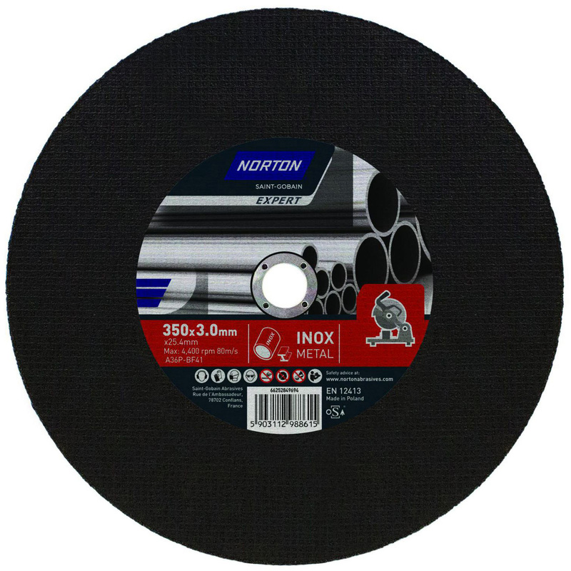 Gives a fast straight cut on steel and stainless steel. Made to EN12413 and OSA standards. These Norton cutting discs are designed to give you a fast, straight cut on both steel and stainless steel. They are highly stable and free-cutting, ensuring limited burn on your workpiece. The advanced grain and bond system, including heat-treated aluminium oxide grain, provides a longer wheel life and burr-free cutting. You can slice through the workpiece easily without needing a lot of pressure. * Aluminium oxide grain – provides a fast cut throughout the long life of the disc * Advanced grain and bond system – ensures longer wheel life and burr-free cutting * Highly stable and free cutting – results in limited burn on the workpiece * Extra thick reinforcements – enhances your safety during operation * Available in a choice of sizes and bores | Norton Steel & Inox Cutting Disc 350 x 3.0 x 25.4mm in Black