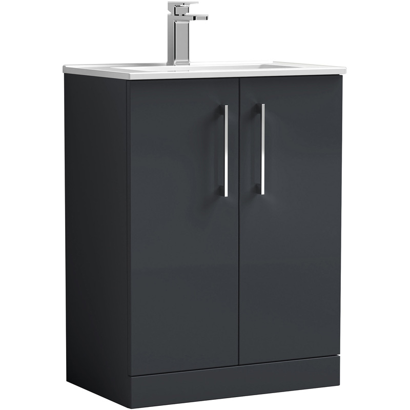 * Contemporary floor standing design provides ample storage for all your bathroom toiletries and cleaning supplies * Available in 8 sleek colour ways * Soft close doors ensures peace ensues throughout your home * Supplied rigid for easy installation * Vitreous china basin pre-drilled with 1 tap hole Introduce a designer look to any modern bathroom with the Arno vanity unit. A stylish minimalist basin sits on top of this double-door cabinet to create a truly contemporary aesthetic - with an attractive soft black finish bringing out the best in any interior. The floorstanding unit maximises storage space for bathroom essentials such as toiletries or cleaning equipment. Soft-close hinges ensure a smoother and quieter closing action to reduce daily wear and tear. Fitting this bathroom sink unit is quick and easy too - it comes pre-assembled to speed up installation times, and looks fantastic alongside other matching units in the Arno collection.* Floorstanding vanity unit with double-door cabinet* High-quality vitreous china basin included* Minimalist basin with inner bowl depth of 120mm* Soft-close hinges for a smooth and quiet action* Soft black finish creates a smart designer look* Doors include a modern chrome D-shape handle* 16mm thick MFC cabinet with 18mm MDF fascia* Unit manufactured using FSCĀ® Certified materials* Comes pre-assembled for a quicker installation* Basin has one tap hole - tap and waste not included* Five-year guarantee from Nuie Bathrooms (T&Cs apply)DIMENSIONS* Bathroom cabinet only - 800(H) x 600(W) x 383(D)mm* Including basin (no tap) - 815(H) x 600(W) x 390(D)mm | Nuie Arno Double Door Floor Standing Vanity Unit Soft 600mm With Minimalist Basin in Black | MFC