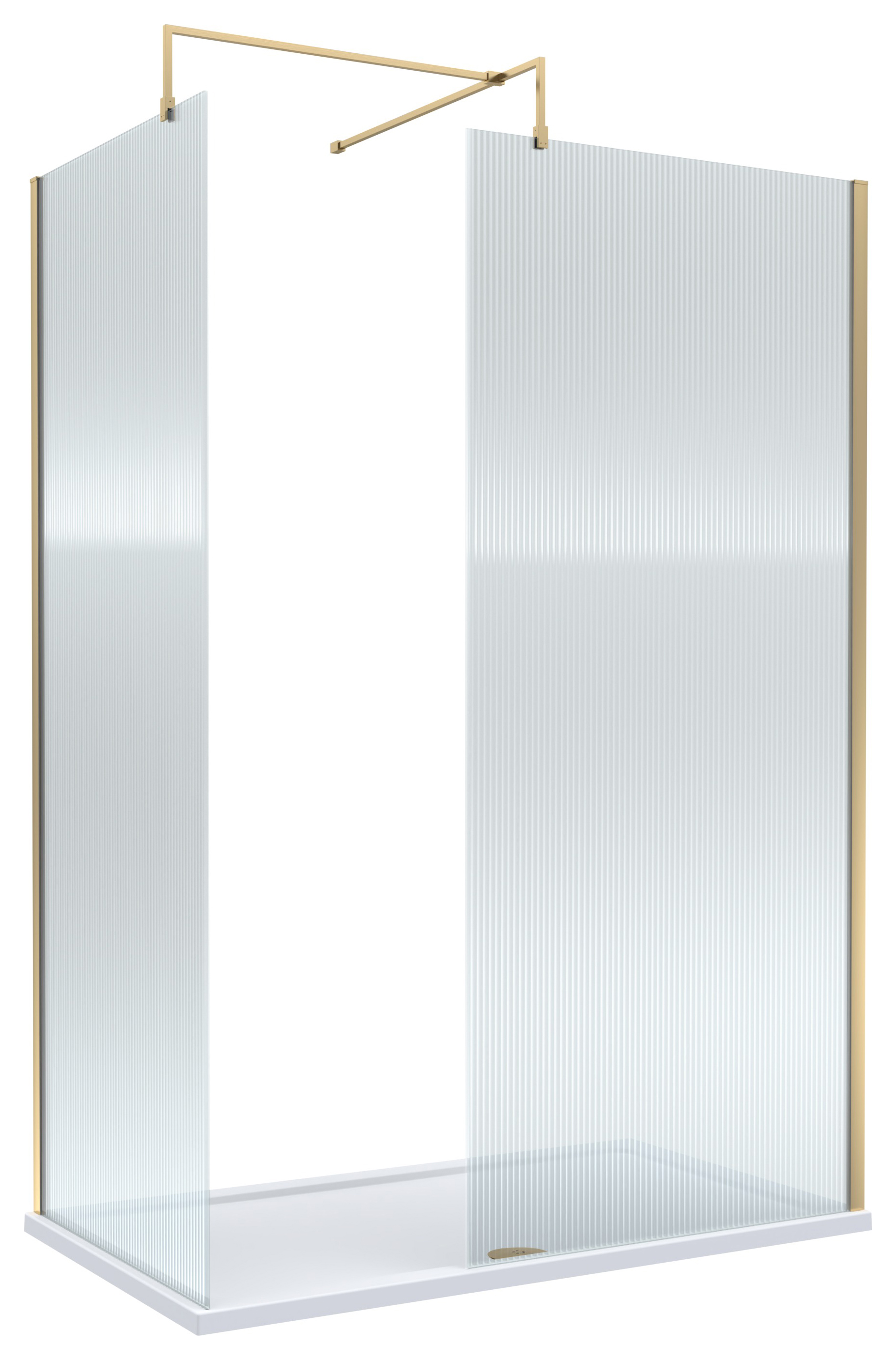 Nuie Brushed Brass Fluted Wet Room Screen, Shower Tray & Waste - 1400 x 800mm - A modern walk-in bundle, allowing you to create a luxurious showering space, giving you a spa like experience in your own home. Each shower tray is manufactured from high quality materials, here in Great Britain, to the highest quality and standards. The walk-in screens are manufactured from 8mm toughened safety glass with a modern aluminium profile.