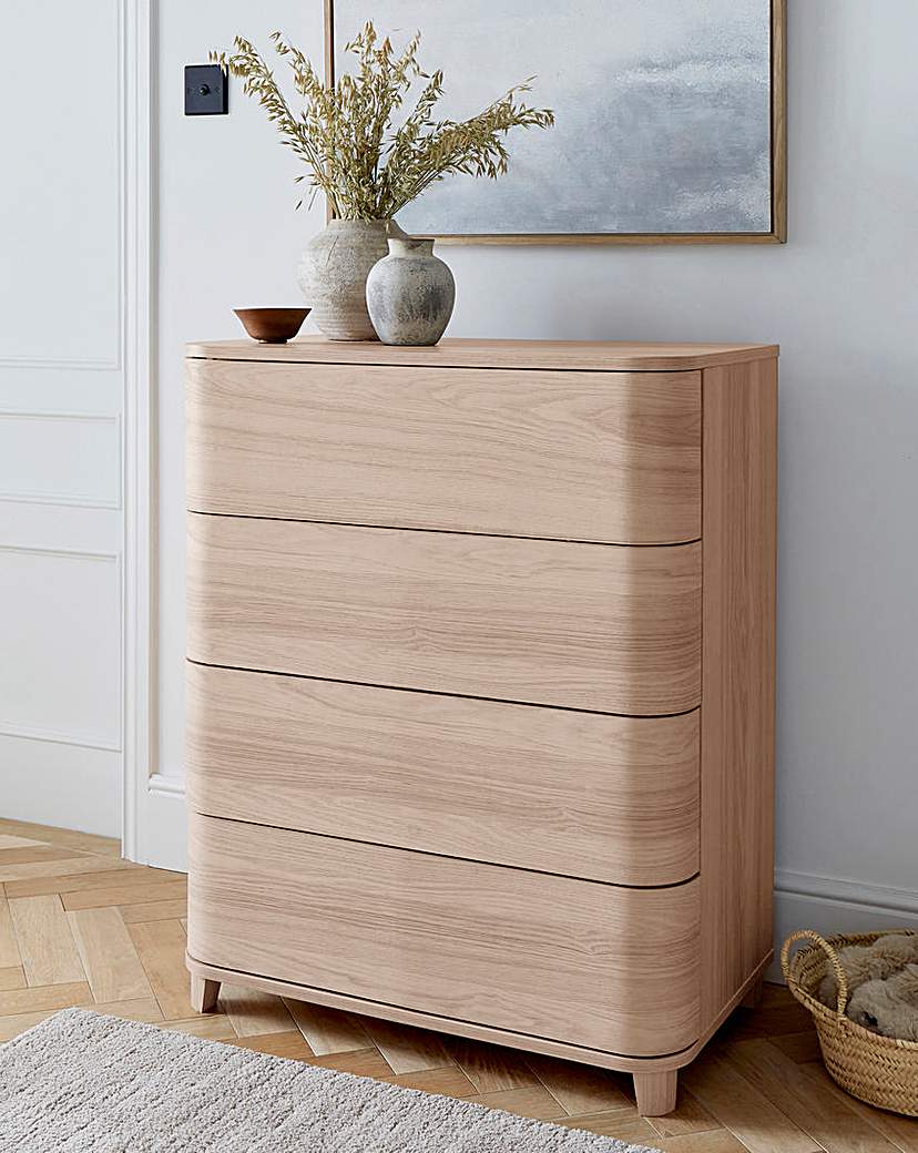 The Arden Small Chest of Drawers as 4 drawers finished with a curved sides and an oak effect. Self assembly
