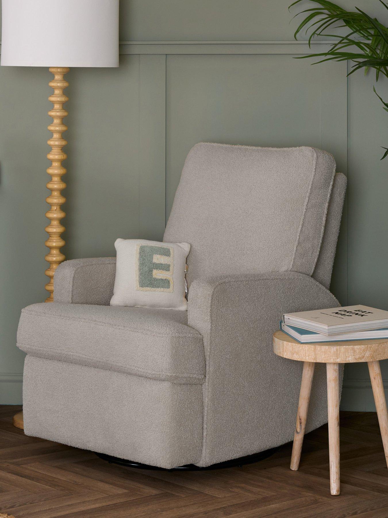 Obaby Madison Swivel Glider Recliner Chair - Teddy Truffle The Obaby Madison Recliner Nursery Chair has been upgraded to be extra cosy with Olive-coloured soft teddy bear fabric. The new teddy bear fabric wraps you in a warm embrace as you recline or enjoy the smooth glide motion, making it the perfect cosy spot for any nursery. Designed for flexibility and comfort, the Madison's 360-degree swivel allows you to glide effortlessly from side to side, reach for nearby essentials, or enjoy a gentle, calming motion, helping soothe your baby to sleep. The high-quality ball bearings in the glider mechanism ensure an almost silent, smooth glide, perfect for late-night feedings and nap-time cuddles. With generously padded armrests and a supportive backrest, this chair is designed for those longer snuggle sessions. The teddy bear fabric adds a touch of warmth and comfort, creating an inviting retreat that's perfect for your nursery. Whether soothing your baby back to sleep or enjoying some peaceful downtime, the Madison Recliner will be your go-to spot for comfort and relaxation. " Depth: 97 CM Height: 100 CM Width: 75 CM Assembly: Self Assembly Luxuriously Soft Teddy Bear Fabric: Experience the ultimate in cosiness with our unique, plush fabric that warmly wraps you. Smooth Gliding Motion: The chair?s ball-bearing glide system offers a seamless, gentle motion to help lull your baby to sleep. 360-degree Swivel Base: This base offers the flexibility to move and adjust without disrupting your baby, offering convenience and ease.