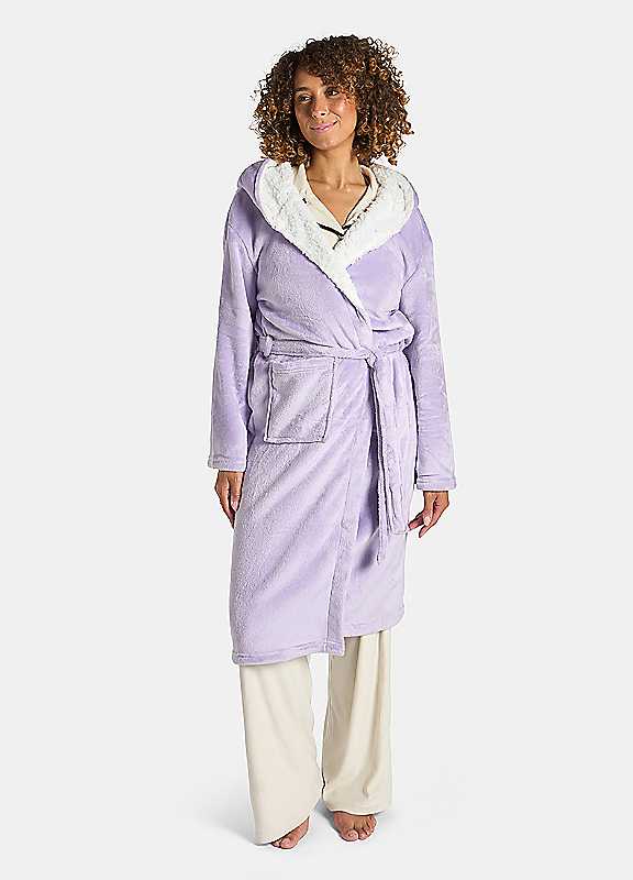 OHS Flannel Fleece Hooded Dressing Gown - Sherpa Bathrobe - Lilac - Size ONE SIZE