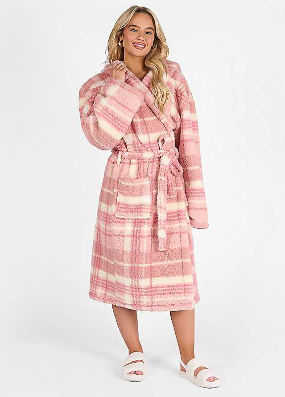 OHS Teddy Dressing Gown - Tartan Check Plush Soft Womens Hooded Cosy Loungewear Robe - Pink - Size ONE SIZE