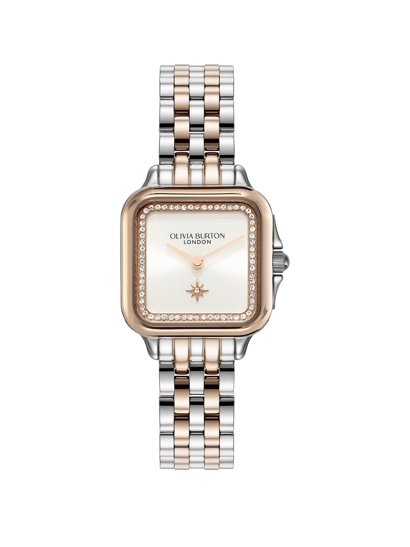 Olivia Burton 28mm Stainless Steel and Rose Gold Grosvenor Watch Olivia Burton 28mm stainless steel and rose gold IP case, white sunray dial with a North Star and crystal detail. Finished on a two toned stainless steel and rose gold IP link bracelet. Water resistant to 3ATM. 24Hr Display: N Case Diameter (in cm): 2.8 Case height (in cm): .7 Case Length (in cm): 2.8 Case Shape: Square Case Width (in cm): 2.8 Fastening Type: Bracelet Glass: Mineral Movement: JapaneseQuartz(battery) Strap Material: Stainless Steel Water Resistant: N