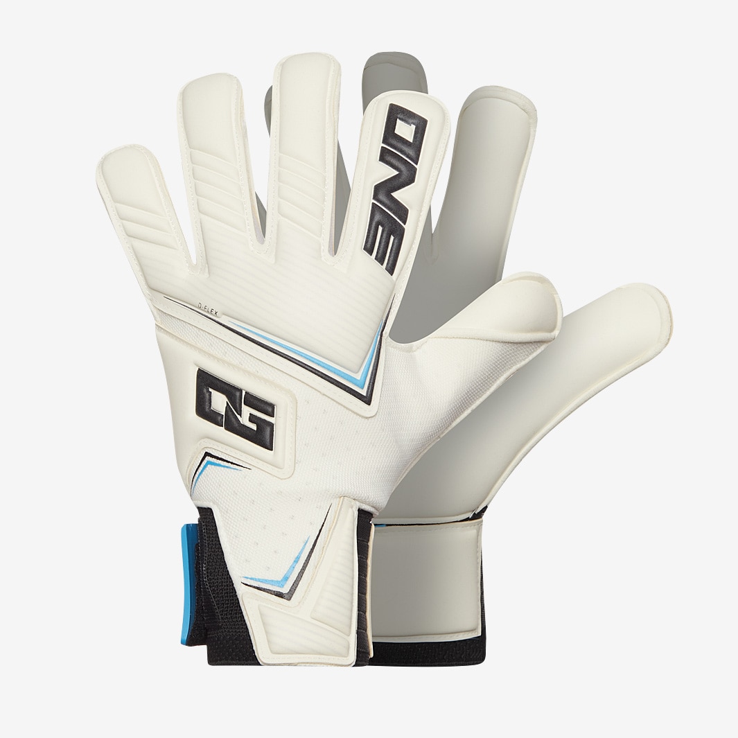 Take your game to the next level with ONE Kids NXT Pro Hyla Cut goalkeeper gloves in WhiteBlackBlue. The result of two years of intensive research and development, the ONE NXT provides unrivalled comfort and fit, picking up the mantle as the brands goto series for keepers who prefer a more protective, padded glove. ONE have been in the lab obsessing over the smallest details, from the elasticity of the wrist to the length of the strap, finessing every element to get the design just right. On the Pro edition, theres Pro Grade Contact latex on the palm for outstanding grip and control, while the DFLEX punch shield on the back allows natural movement of the hand. That extended wrap around the side of the backhand, showing off the new OG logo, has a secondary effect of giving an even more secure fit during play. The inside of the glove features ONEs latest Echo Form 2.0 system, which fine tunes the number and placement of the silicone elements applied internally at the fingertips, thumb, and palm to prevent slippage. The wrist uses a new Quantum Elastic formula for a tight yet soft feel, while the easily adjustable Reverse Mid Split strap features a rubber tab to avoid friction with the thumb as you lock in. Latex Palm 4mm Pro Grade Contact Latex Body Super soft Cut Hyla flat at base of fingers, stitchless rollfinger at tips Strap NEW Reverse Mid Split latex Wrist Entry NEW Quantum Elastic Body UrgoTract ergonomic and breathable Spines No Internal Grip NEW Echo Form 2.0 Elite in dry conditions great in wet good durability
